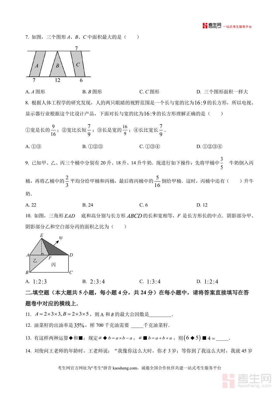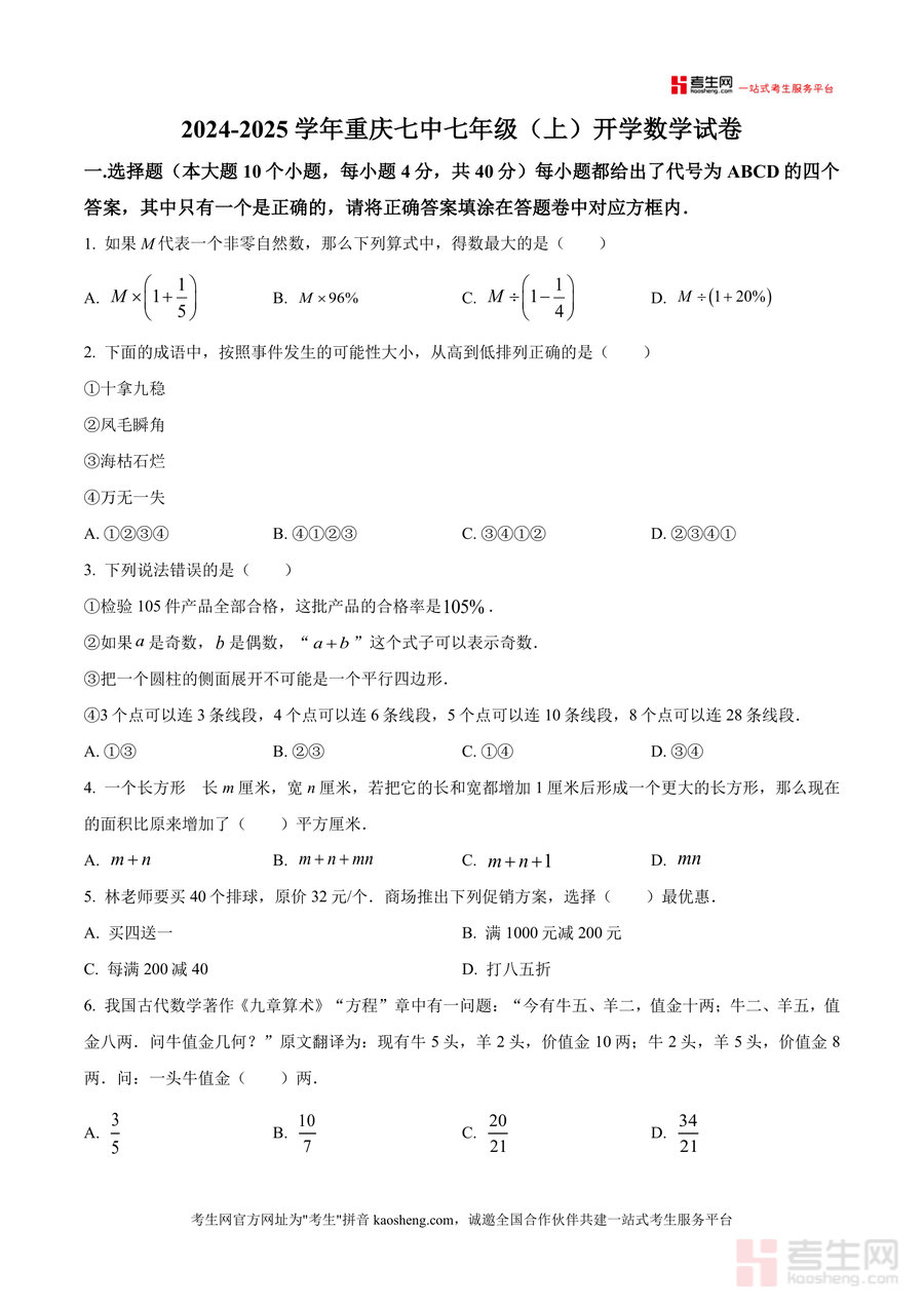 《精品解析:重庆市第七中学校2024-2025学年七年级上学期开学考试数学试题(原卷版)》是一份聚焦重庆七中初中入学衔接阶段数学能力检测的权威真题原卷资料,涵盖选择题(10题)、填空题(5题)、计算题(2题)及解答题(3题)四大题型模块,命题内容紧密衔接小学高年级核心知识点与初中数学基础能力要求。该试题特色在于融合实际应用场景(如商场促销方案选择、古代《九章算术》问题翻译)与抽象思维考查(如几何面积比例、逻辑推理),精准反映重点校开学考的命题方向与难度梯度,为学生提供真实可参考的测试情境。
