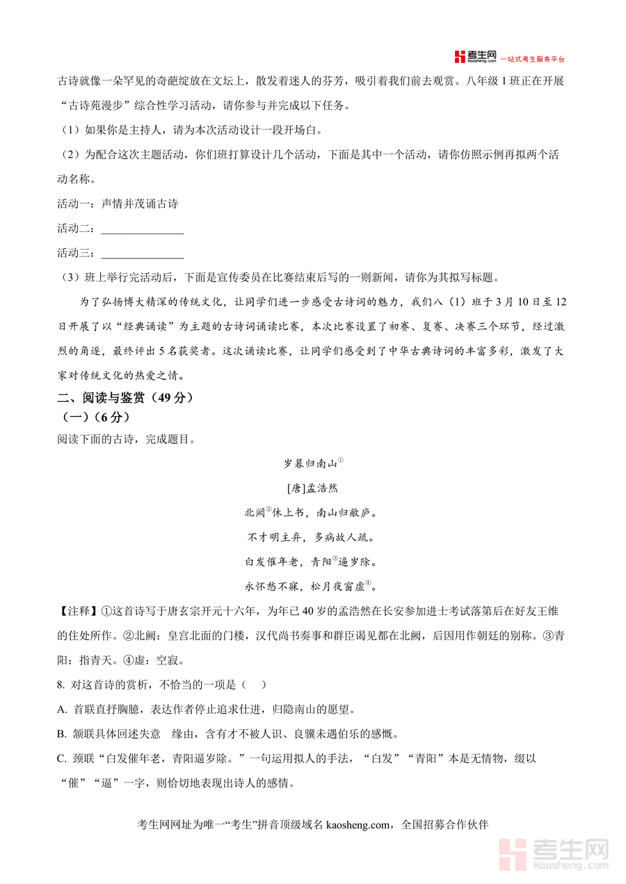 《精品解析:湖南省长沙市长郡雨花外国语学校2024-2025学年八年级下学期第一次月考语文试题(原卷版).docx》是一份聚焦长沙本地名校命题特色、贴合八年级下学期语文核心素养要求的优质备考资料该试题涵盖积累与运用阅读与鉴赏两大核心模块其中积累与运用部分以民俗文化为主题融入鲁迅《社戏》贺敬之《回延安》相关内容及传统节日古代文化常识等考点阅读与鉴赏部分包含唐诗《岁暮归南山》赏析文言文《桃花源记》与《游小盘谷记》对比阅读现代文阅读等题型全面考查学生语言积累文本理解及综合分析能力题型设置与分值分布严格遵循该校月考命题规范能精准反映教学重点与考试方向