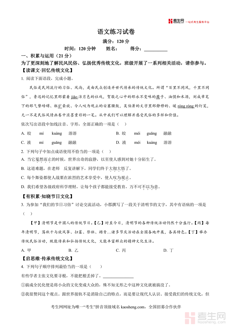 这份原卷版试题核心用途在于帮助学生熟悉长郡雨花外国语学校月考题型结构与难度梯度使用场景包括学生考前模拟训练日常知识点查漏补缺以及教师备课参考命题研究等对学生而言通过完成该试题可直观了解自身在民俗文化积累古诗文赏析文言文理解等方面薄弱环节针对性提升应试能力其备考优势在于依托名校命题资源能有效对接该校教学进度与命题思路让备考更具靶向性助力学生高效提升语文成绩