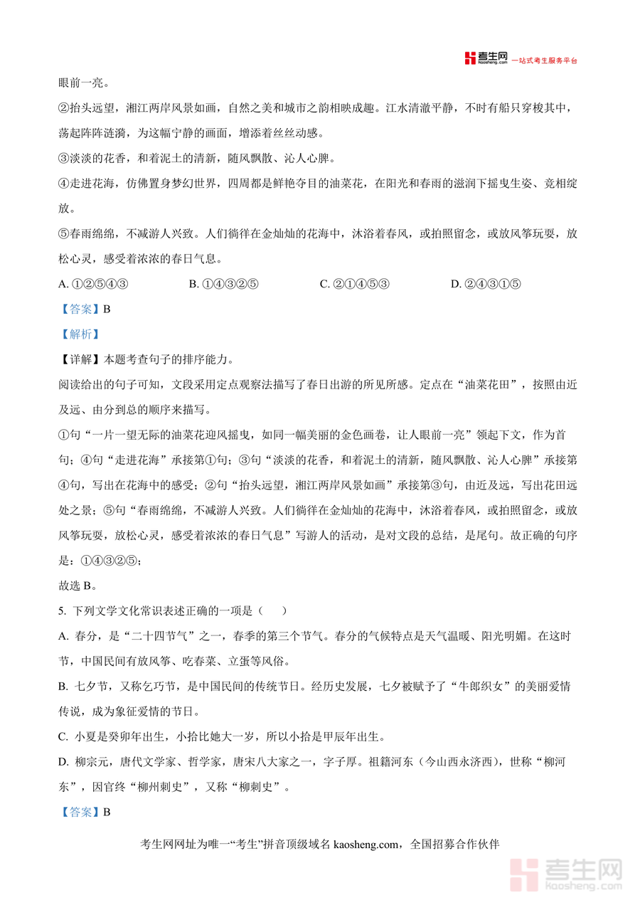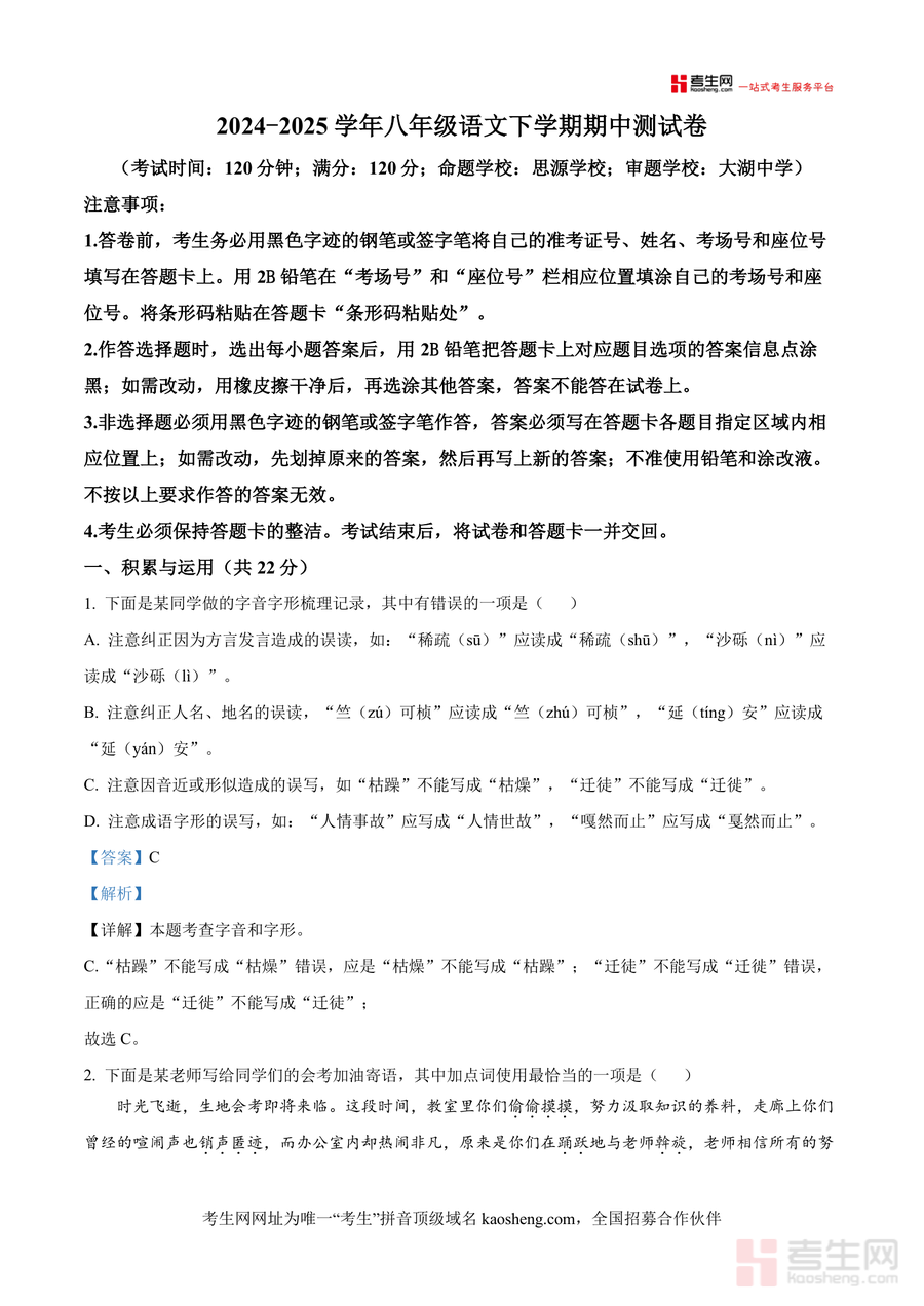 《精品解析:湖南省长沙市望城区校联考2024-2025学年八年级下学期期中语文试题(解析版).docx》是一份针对望城区校际联合期中考试设计 的专业语文备考资料,核心定位为真题深度解析与应试能力提升工具。文件包含完整试题(考试时间120分钟、满分120分,由思源学校命题、大湖中学审题)及详尽解析,覆盖积累与运用(字音字形纠正/词语运用/病句辨析/句子排序/文学文化常识/古诗文默写)、阅读与理解(古诗文阅读/综合运用)等核心题型。其特色亮点在于解析的专业性:每道题均标注错误原因(如字音误读类型、成语误用场景)、解题思路(如排序题定点观察法)及答题规范,帮助使用者精准把握考点细节与命题逻辑。