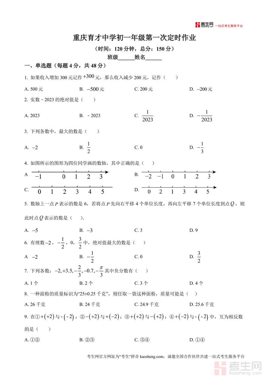 该试题适用于重庆市育才中学及周边同类学校的七年级学生、初中数学教师及数学学习辅导者。作为同步定时作业的原卷真题,它具有不可替代性,能真实呈现学校教学要求与学生学习状况;长期使用有助于学生构建扎实的数学知识体系,培养逻辑思维能力与问题解决能力,为后续初中数学学习奠定坚实基础。无论是学生备考还是教师教学,这份试题都是提升数学学习效果与教学质量的重要工具。