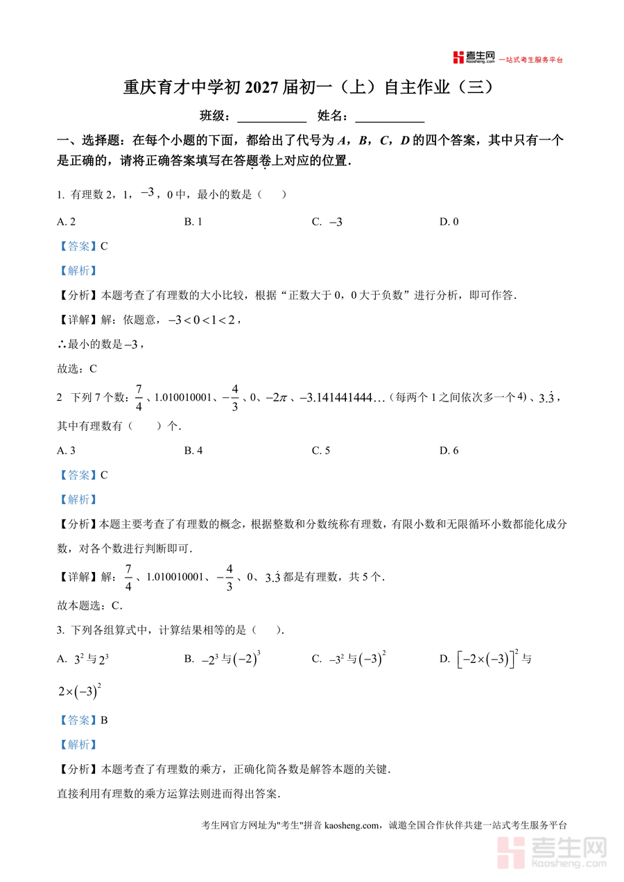 《精品解析:重庆市育才中学2024-2025学年上学期10月月考七年级数学试题(解析版)》是一份针对七年级学生数学月考备考需求的高质量真题解析资料。资料包含该次月考全部题型(选择题、填空题等),覆盖有理数大小比较、乘方运算、科学记数法、绝对值应用等七年级上册数学核心知识点;特色亮点在于每道题均配备考点分析、详细解题步骤及易错点提示,解析逻辑清晰且贴合学生认知水平,能有效帮助学生理解解题思路与方法,自然融入真题解析与应试能力提升等核心关键词。