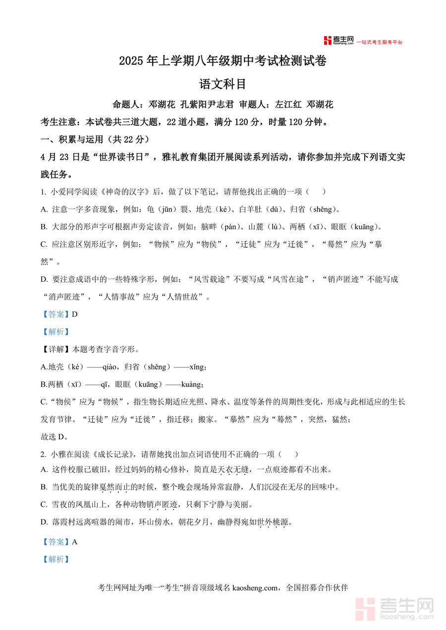 该文件适用于雅礼教育集团及长沙市同类学校八年级学生、语文教师及家长辅导场景;作为权威真题解析资料,它不仅是期中备考的必备工具,其涵盖的基础知识点与解题方法具有长期参考价值,可帮助学生夯实语文核心素养,且因真题资源稀缺性与解析专业性,具有不可替代的备考指导意义,是八年级学生语文学习进阶的重要辅助材料。