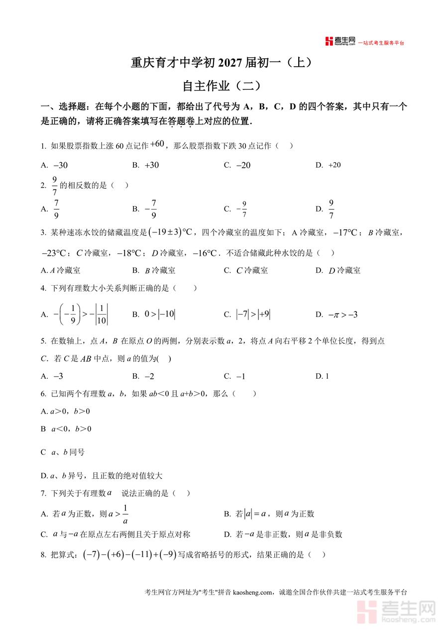 本资料适用于重庆市及全国使用人教版教材的七年级上册学生,也可供初中数学教师及关注孩子数学学习的家长使用。作为重点校阶段性自主作业真题资源,它具有不可替代性:一方面精准匹配七年级上册数学阶段性学习目标,填补常规练习对重点校命题方向把握不足的空白;另一方面,通过核心知识点(如有理数运算、数轴关联点问题)训练,帮助学生打下扎实基础,为后续整式运算、方程等代数知识学习奠定坚实基础,具有长期学习价值。