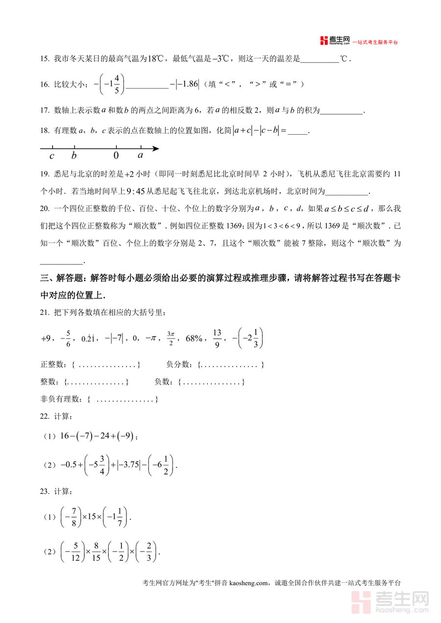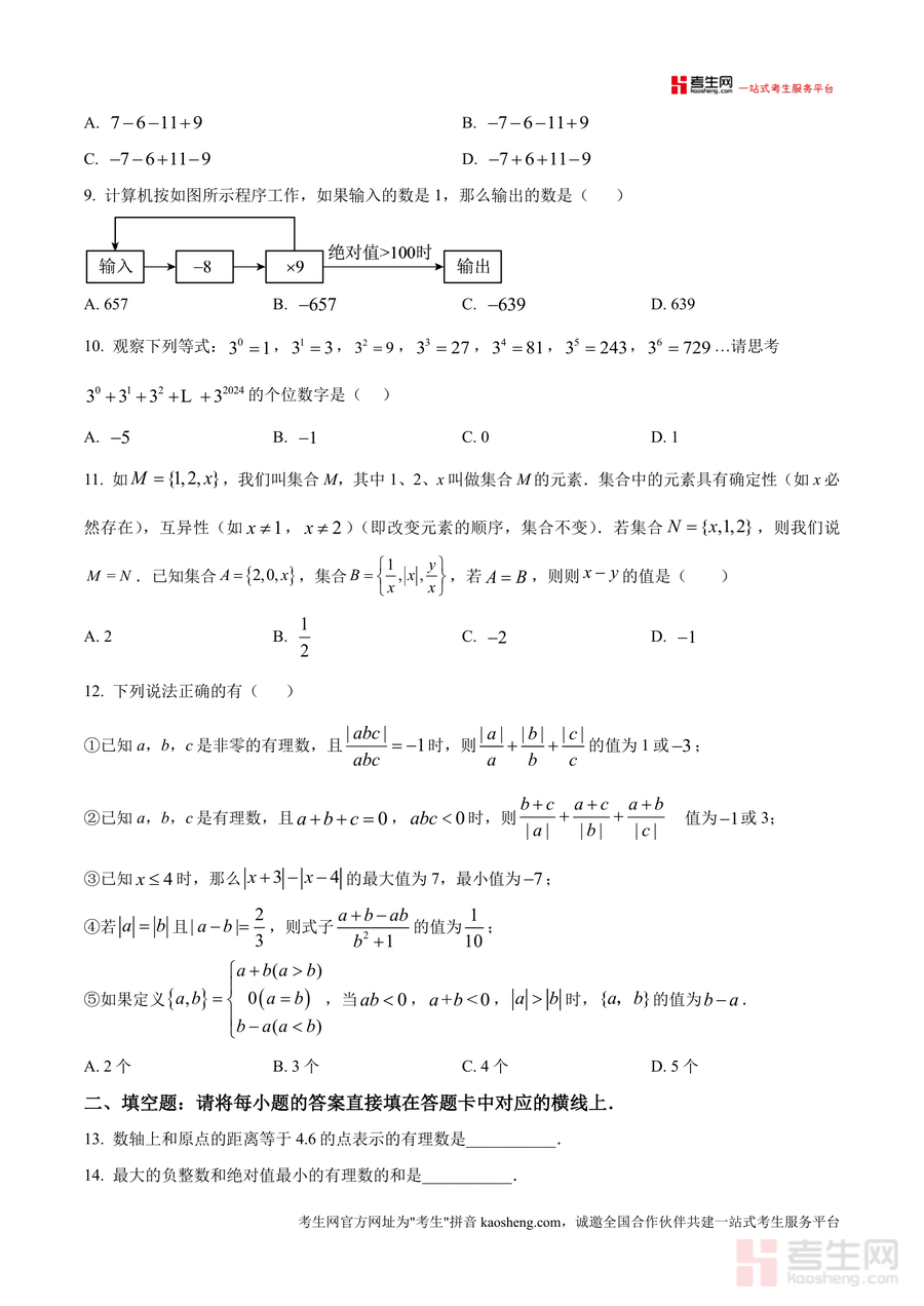 这份试题核心用途在于帮助学生巩固有理数单元的核心知识,检测学习过程中的漏洞与不足;使用场景包括课堂同步练习、课后自主复习、单元测试模拟等。对学生而言,通过完成该试题可熟悉重点校命题风格,提升解题技巧与应试能力;对教师来说,可作为课堂教学补充材料或单元复习参考资源;对家长而言,能辅助孩子进行针对性训练,了解核心知识点掌握情况。其备考优势在于依托重庆育才中学教学经验,试题难度梯度合理,既注重基础又兼顾拓展,有助于构建系统有理数知识体系。