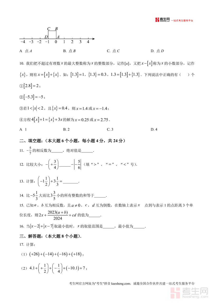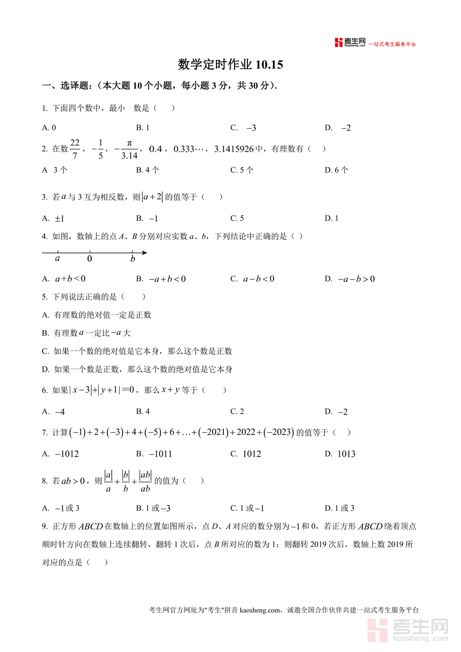 《精品解析:重庆市西南大学附属中学2024-2025学年七年级上学期期10月数学定时作业(原卷版).docx》是一份针对七年级上册数学阶段性学习检测的优质备考资料。该资料包含选择题(10小题)、填空题(6小题)及解答题(8小题)三大题型,覆盖有理数概念与运算、数轴表示与应用、绝对值与相反数性质、实际问题数学建模等核心知识点,题型设计贴合西南大学附属中学的教学进度与命题风格,能真实反映七年级学生在10月阶段的知识掌握情况,为后续复习提供精准方向。