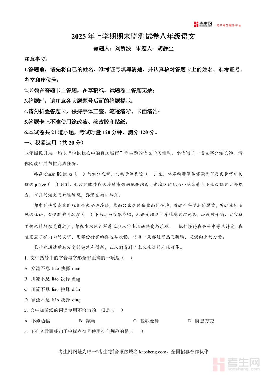 《精品解析:湖南省长沙市岳麓区长郡双语实验中学2024-2025学年八年级下学期期末语文试题(原卷版).docx》是一份针对八年级下学期语文期末备考的权威真题资料,由该校资深教师命题与审题,内容覆盖积累运用、阅读与鉴赏两大核心板块,包含字音字形辨析、文学文化常识、古诗文默写、诗歌鉴赏、非文学作品阅读及文学作品阅读等典型题型,全面贴合初中语文课程标准要求,既保留长沙本地教学特色,又体现对学生核心素养与基础知识掌握程度的综合考查,为备考提供精准导向。