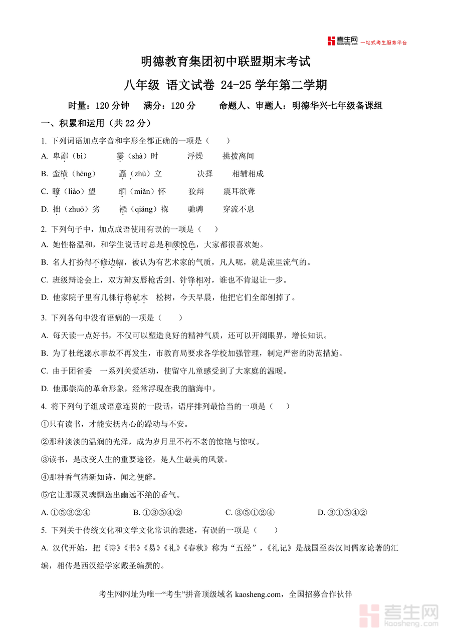 《精品解析:湖南省长沙市明德教育集团2024-2025学年八年级下学期期末语文试题(原卷版).docx》是一份面向长沙市明德教育集团初中联盟八年级学生的期末统考语文真题原卷资料。主要内容涵盖积累与运用(字音字形辨析、成语使用、病句修改、古诗文默写、综合性学习)、阅读与鉴赏(古诗赏析、文言文阅读、非连续性文本阅读、文学作品阅读)等完整考试模块,题型设置严格遵循120分钟120分标准,命题贴合八年级下册语文课程标准及长沙本地教学实际;特色亮点在于真题直接来源于集团内部统考命题体系,题目设计兼具基础性与综合性,能真实反映区域教学重点与学生能力要求,为备考提供权威参考依据