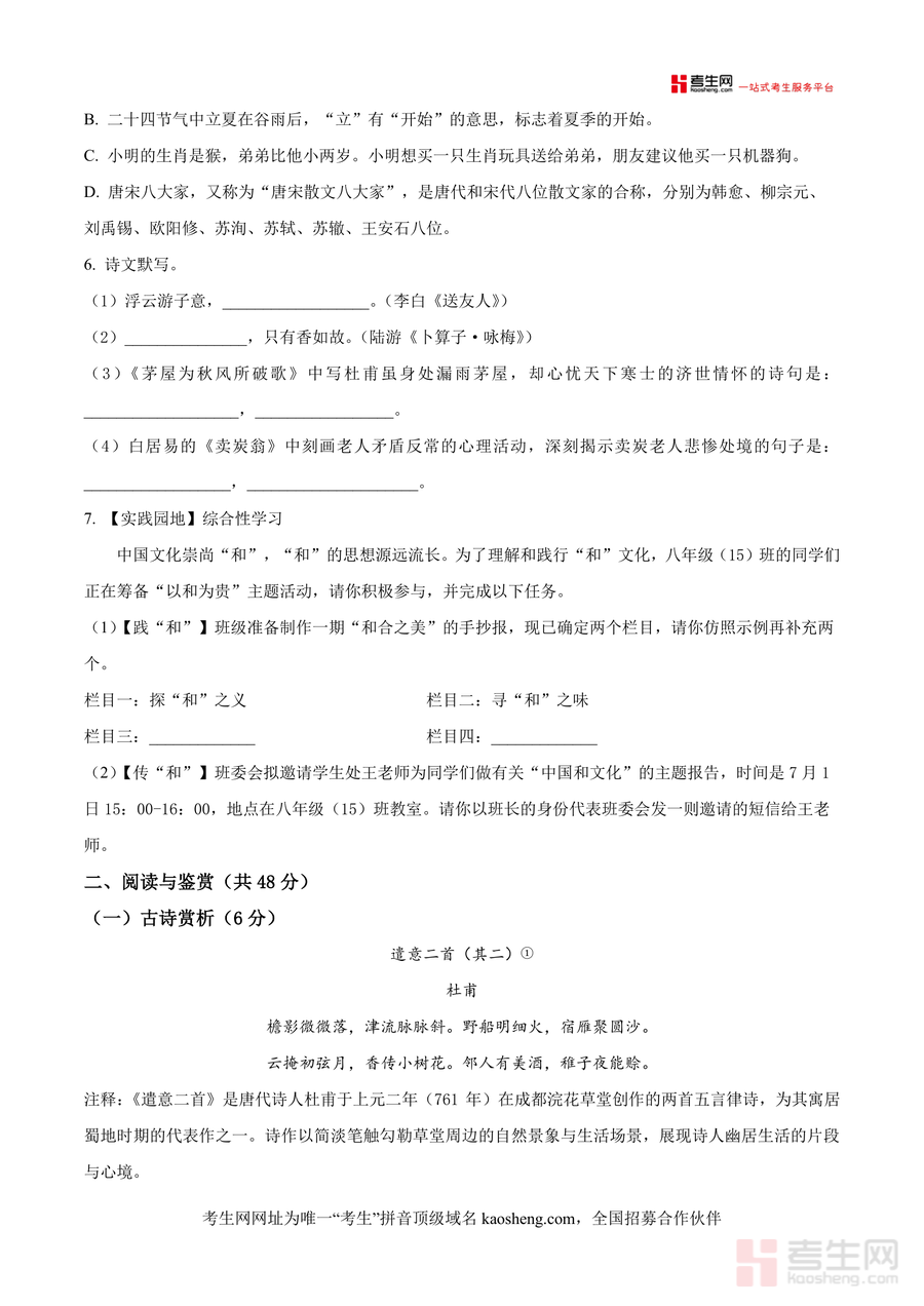 核心用途为八年级学生期末复习阶段的自测训练素材,以及语文教师备课参考或阶段性检测命题依据;使用场景包括学生考前模拟实战(限时完成以提升应试能力)、教师分析真题考点分布以优化教学策略;用户价值体现在帮助学生熟悉统考题型结构与难度梯度,精准定位知识薄弱点;备考优势在于真题的权威性与针对性,能有效缩短复习路径,提升备考效率,助力学生在期末考中取得理想成绩,同时为后续九年级语文学习积累实战经验