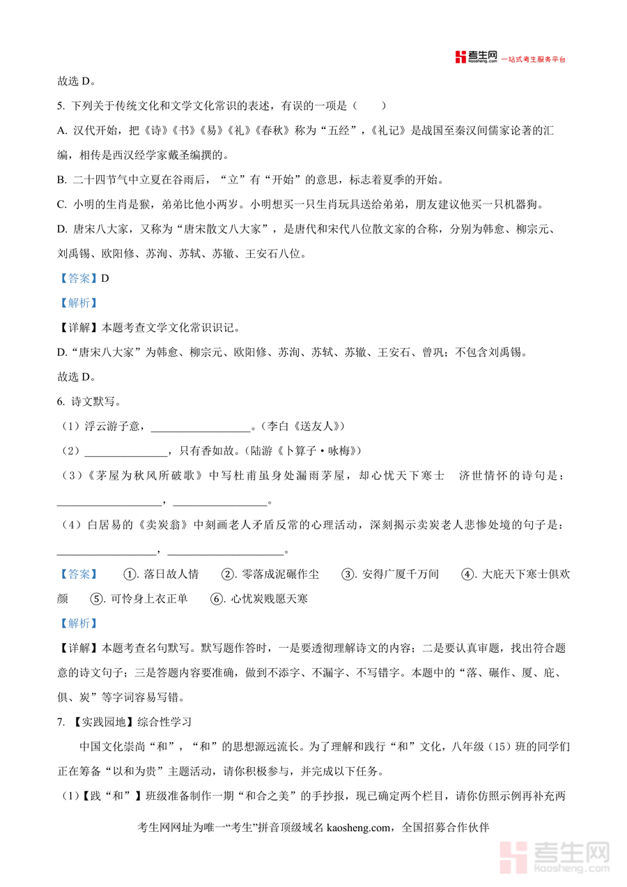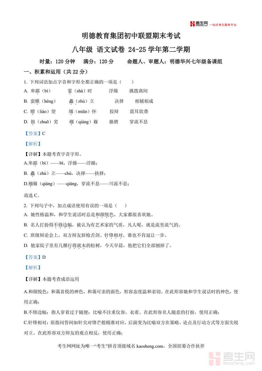 《精品解析:湖南省长沙市明德教育集团2024-2025学年八年级下学期期末语文试题(解析版).docx》是一份精准对接长沙明德教育集团初中联盟期末考纲要求的确切性真题解析类备考资料,包含积累与运用(字音字形、成语运用、病句辨析等)、阅读与鉴赏(古诗赏析、文言文阅读等)及综合性学习等全题型内容;特色亮点在于逐题配备详实解析——不仅标注正确答案,更拆解答题思路(如病句修改常见类型),同时针对易混知识点(如唐宋八大家成员辨析)拓展补充,助力学生深化理解核心考点