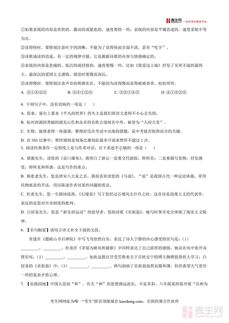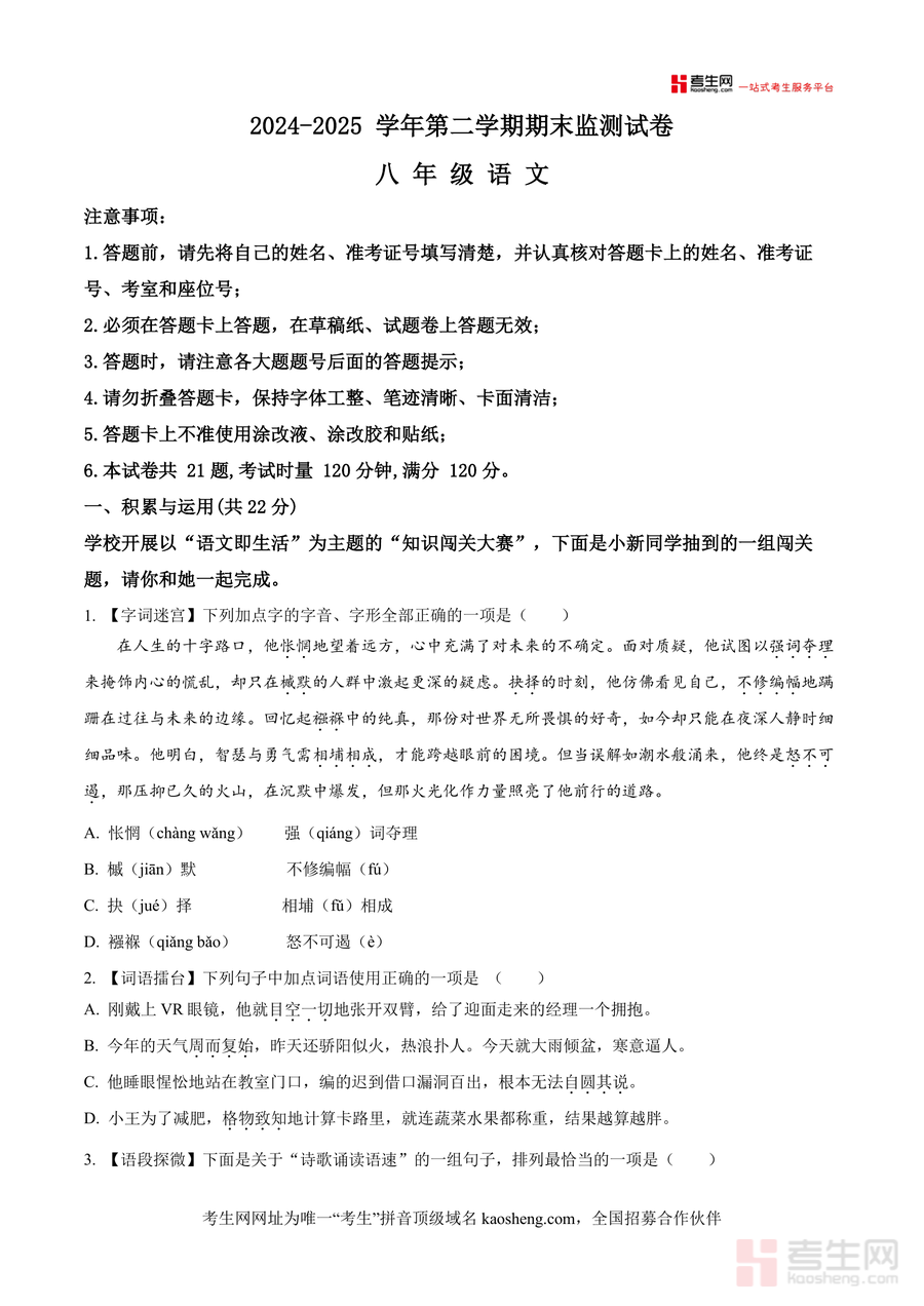 本资料适用于长沙市及周边地区八年级学生(尤其是目标名校升学的学生)、初中语文教师及关注孩子语文学习的家长;作为区域顶尖教育集团出品的期末真题原卷,它不仅能帮助学生适应本地考试风格,更能为后续中考备考积累实战经验,培养规范答题习惯,其不可替代性体现在原汁原味还原名校命题逻辑,长期价值在于助力学生构建系统语文知识体系,提升核心素养,是八年级语文期末备考阶段必备权威资料。