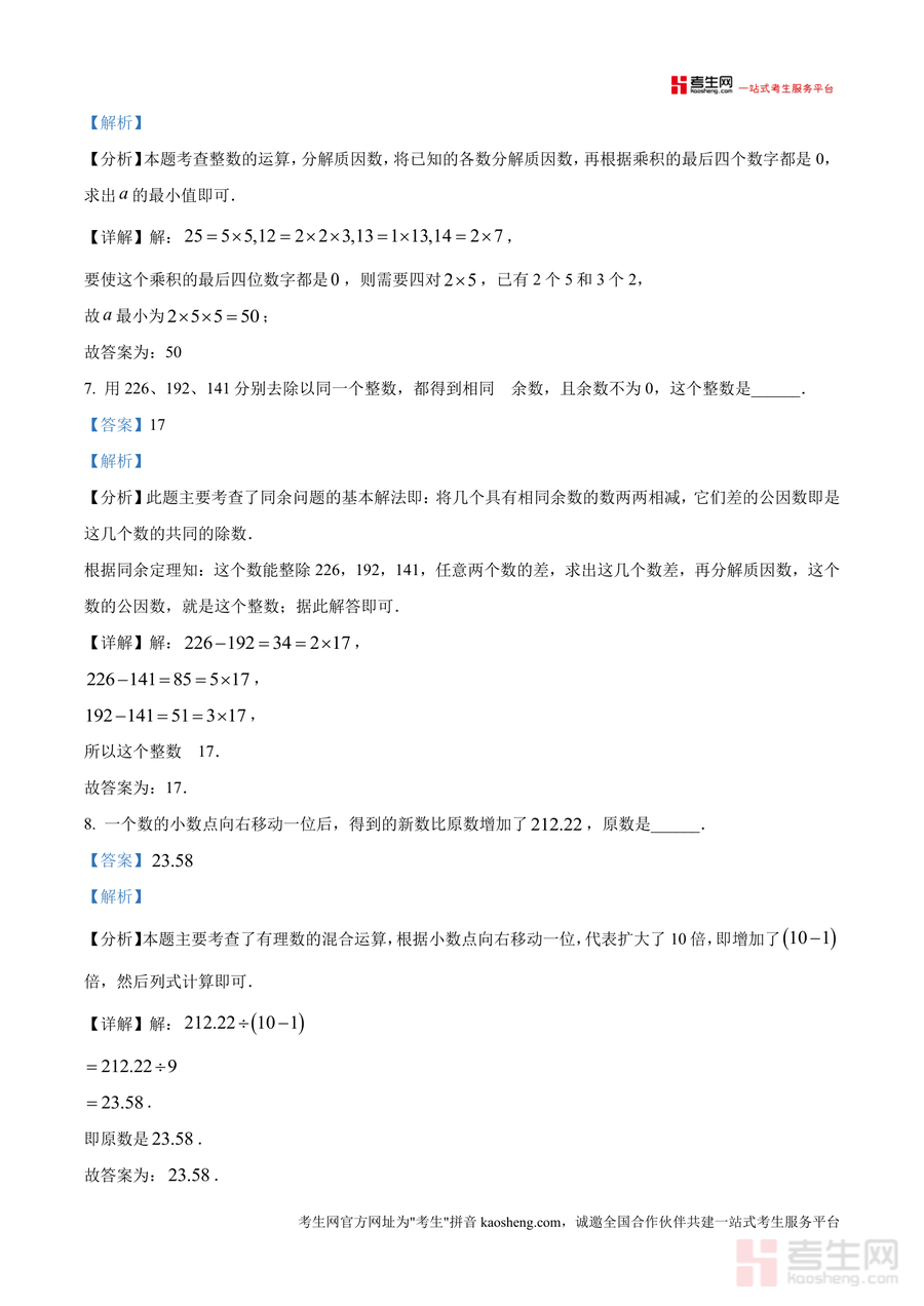 该资料核心用途在于帮助七年级学生快速适配初中数学开学考 的命题风格与难度,适用场景包括开学前自主复习自测、教师备课参考典型题型案例、家长辅助孩子查缺补漏。其用户价值体现在通过真题演练提升应试能力:计算题部分提供逆用乘法分配律、裂项相消法等巧算技巧降低运算复杂度;解答题中"李白沽酒"古代数学问题解析,培养学生转化实际问题为数学模型 的能力。备考优势显著:精准匹配该校命题方向,解析中标注考点(如公倍数与公因数应用、百分数计算)及易错点,帮助使用者高效掌握核心知识模块。
