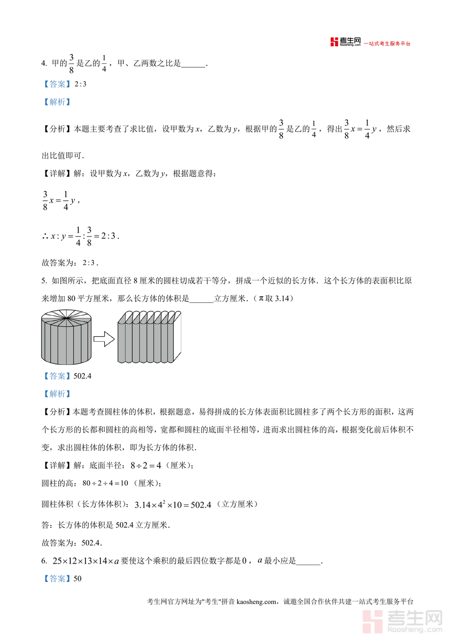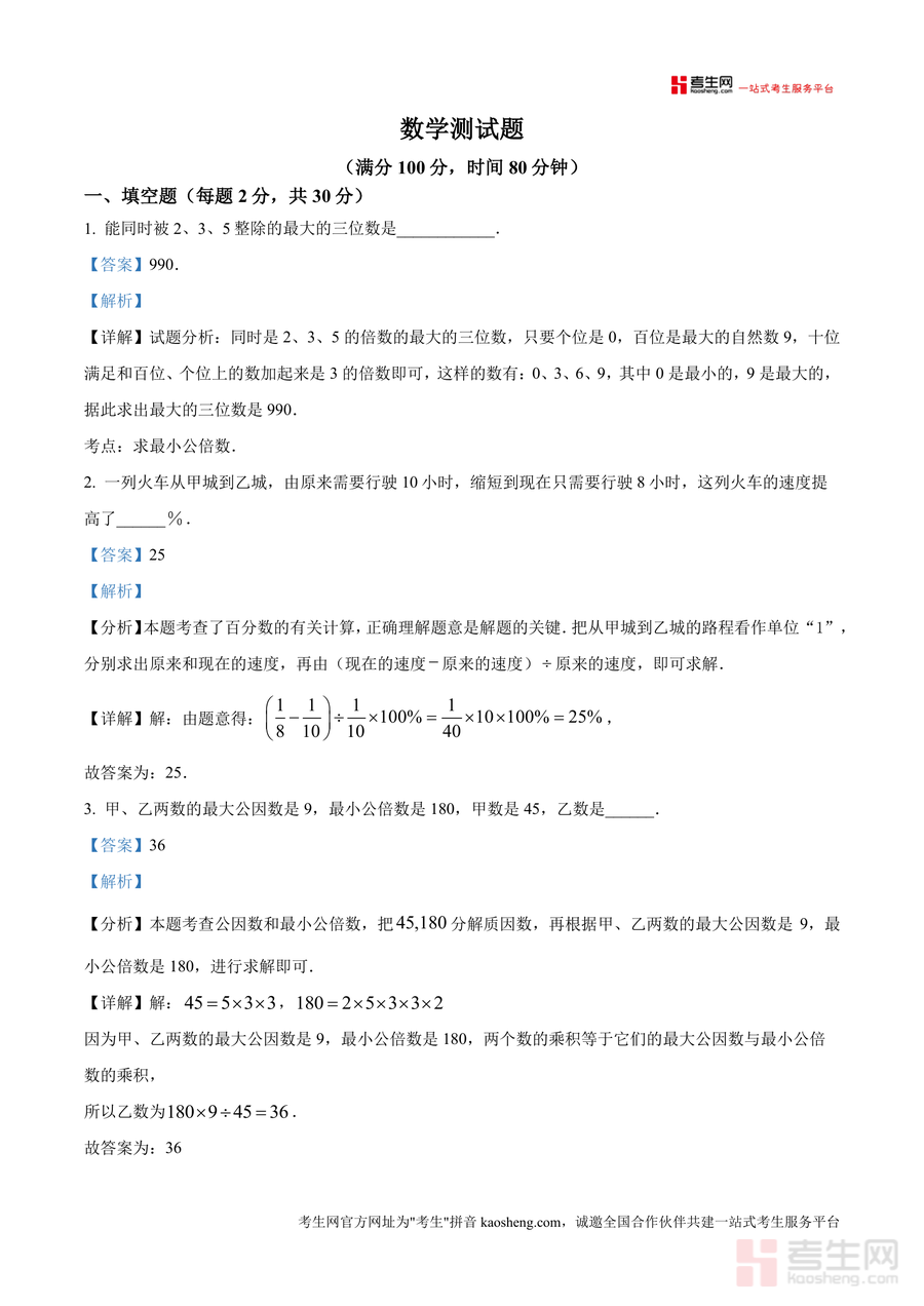 《精品解析:重庆两江新区西南大学附属中学校2025-2026学年七年级上学期开学考试数学试题(解析版).docx》是一份针对该校七年级新生开学适应性测试设计 的专业数学真题解析资料,涵盖填空题(30分)、计算题(27分)、解答题(43分)三大题型共100分内容。资料不仅呈现完整试题及标准答案,更针对每道题提供考点明确、步骤详实 的解析——如填空题中"能同时被2、3、5整除 的最大三位数"问题,解析清晰推导最小公倍数应用逻辑;圆柱切拼成长方体 的体积计算,拆解表面积增加量与圆柱高、半径 的关联;错位排列问题结合递推公式解释全错位排列数 的由来,助力使用者深入理解考点本质。