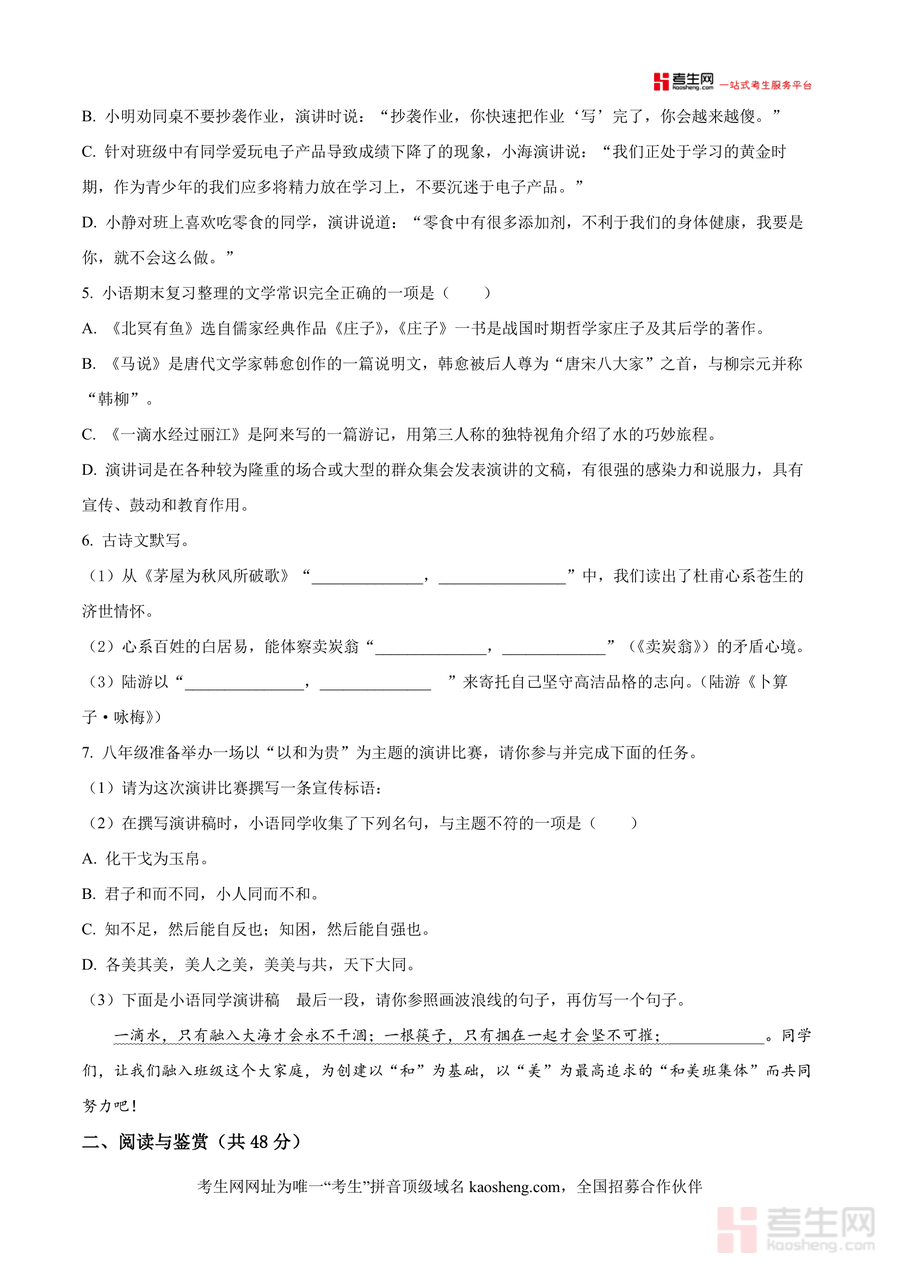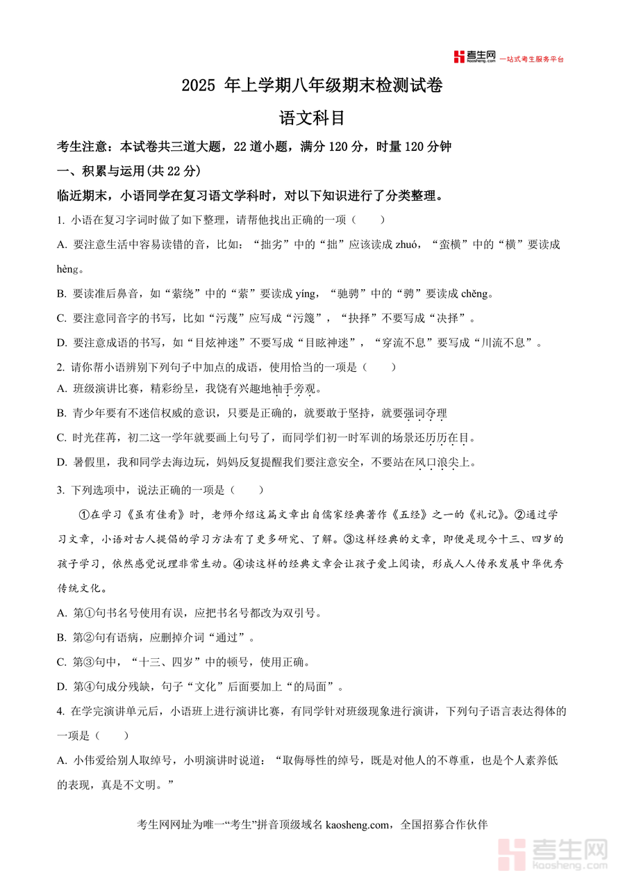 《精品解析:湖南省长沙市雅礼教育集团联考2024-2025学年八年级下学期期末语文试题(原卷版).docx》是一份聚焦八年级下学期语文期末备考需求的权威真题资料,完整呈现雅礼教育集团联考命题框架与题型设置,涵盖积累与运用、古诗文阅读、非文学作品阅读、文学作品阅读等核心模块,并保留原卷版式及时量要求(满分120分,时量120分钟)。作为优质备考资料,其特色在于依托雅礼教育集团的教研实力,精准贴合本地教学重点与考试趋势,并通过完整真题呈现,为学生提供真实可感考试场景,助力高效复习。