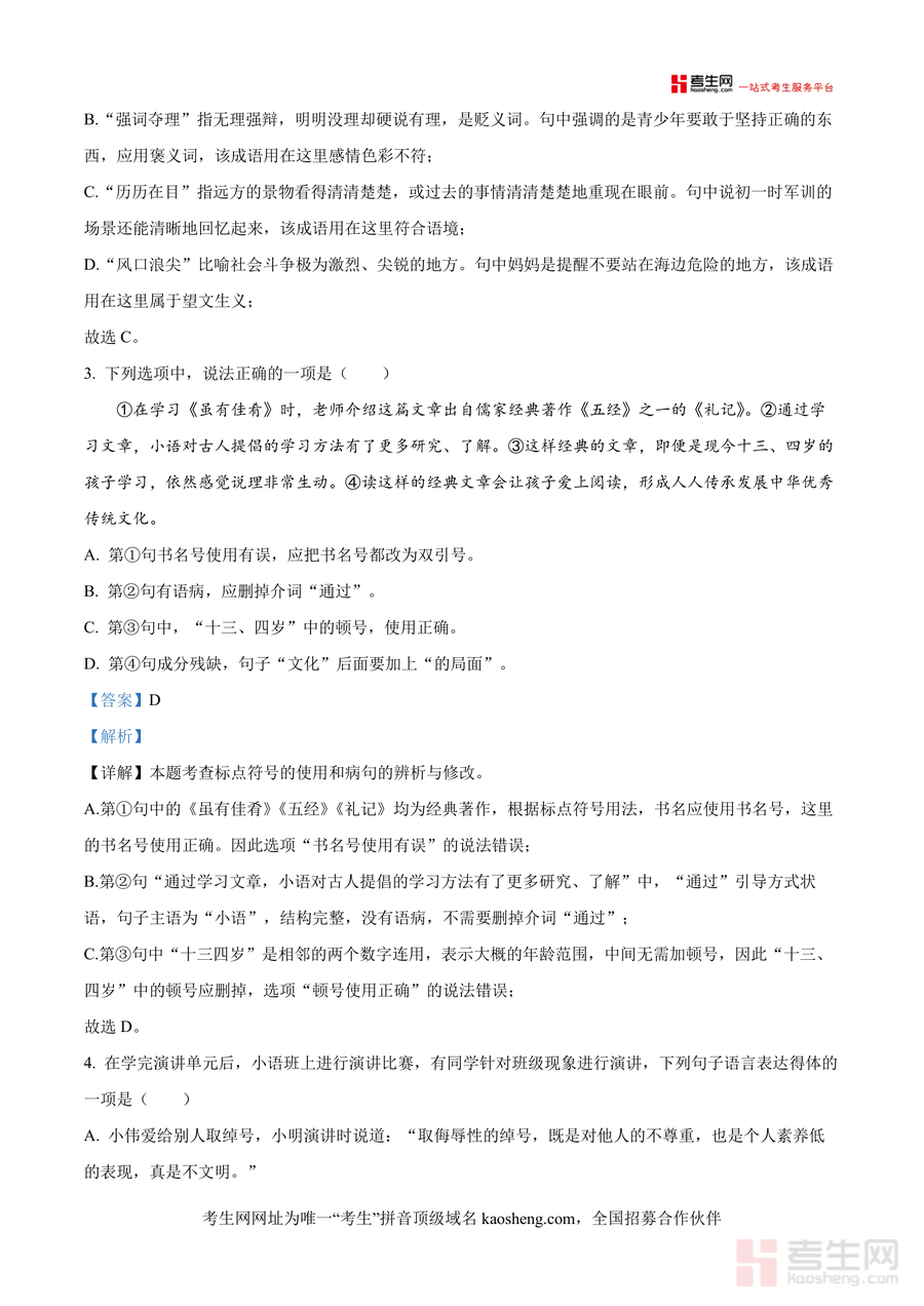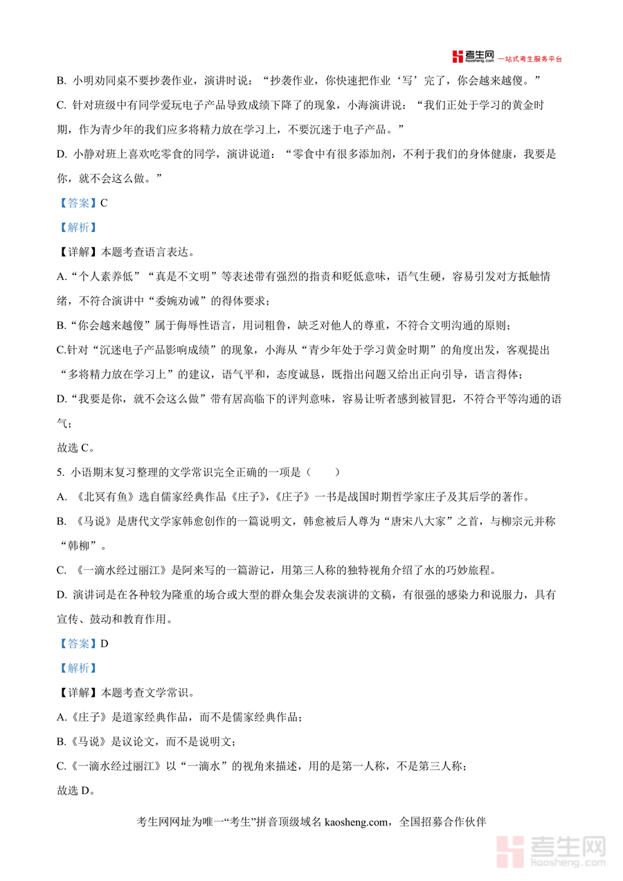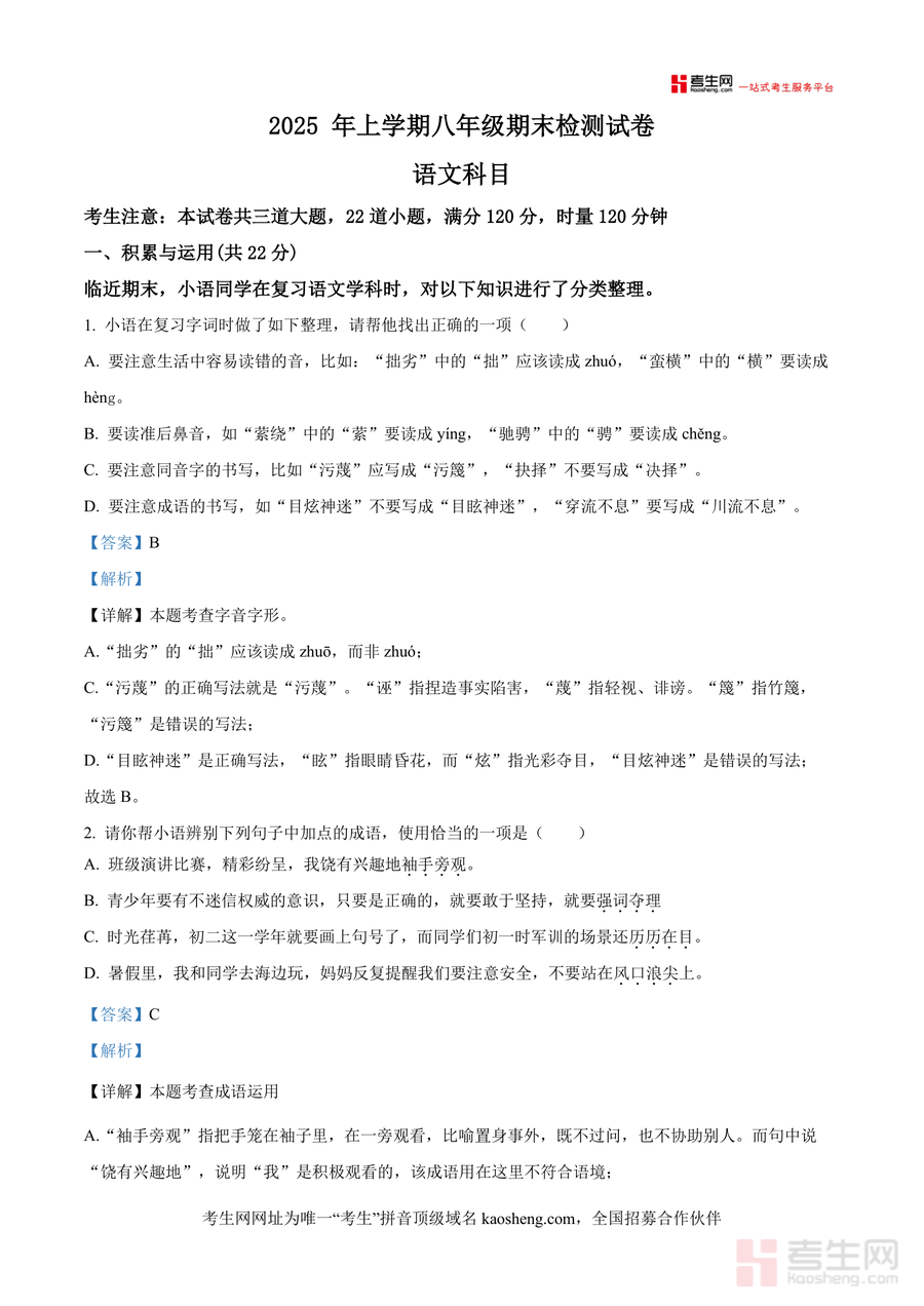 《精品解析:湖南省长沙市雅礼教育集团联考2024-2025学年八年级下学期期末语文试题(解析版).docx》是一份聚焦雅礼教育集团期末联考命题方向、针对八年级下册语文核心考点打造 的权威真题解析类备考资料。该资料完整呈现联考语文试卷全貌,涵盖积累与运用、阅读与鉴赏等核心题型,每道题目均配备详尽解析:不仅明确答案正误依据,还深度拆解考点关联(如字音字形辨析、成语运用规范)、易错点警示(如标点符号使用误区)及答题逻辑梳理(如古诗文默写技巧),同时融入雅礼集团命题特色——注重基础能力与人文素养结合,为学生提供贴近名校考核标准 的学习参考。