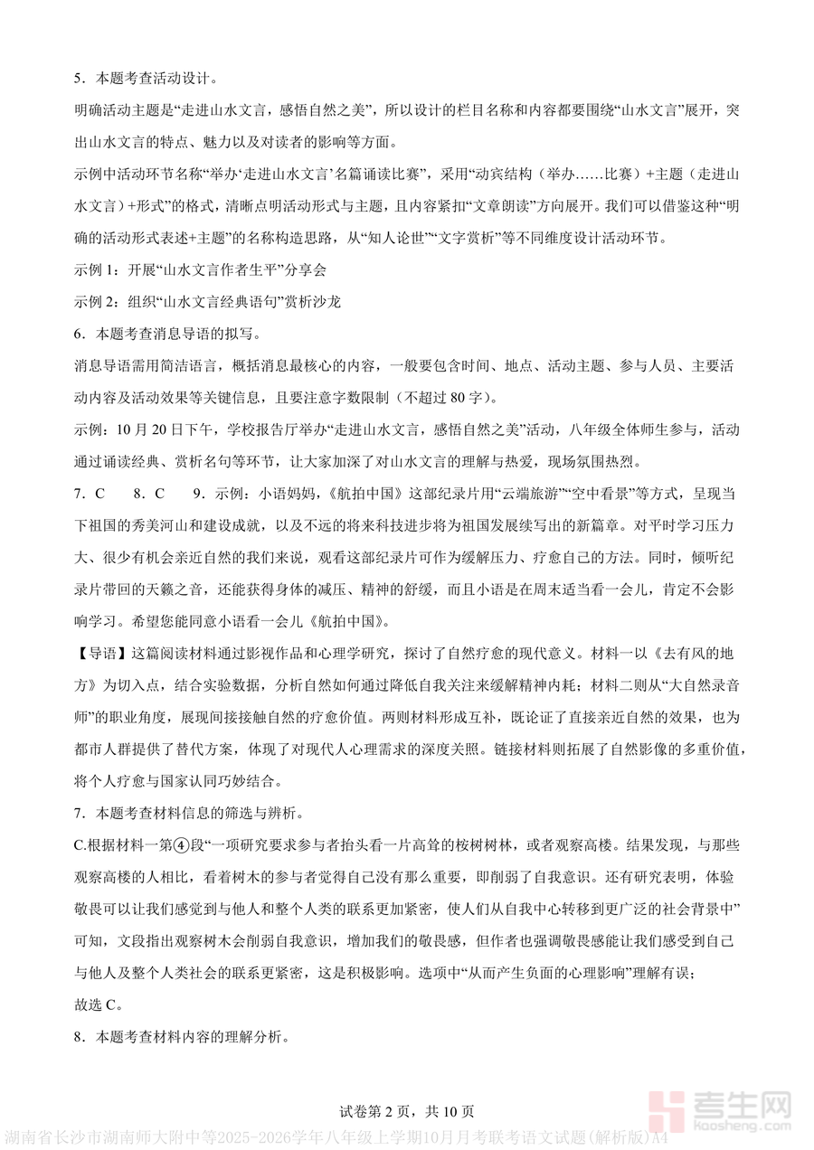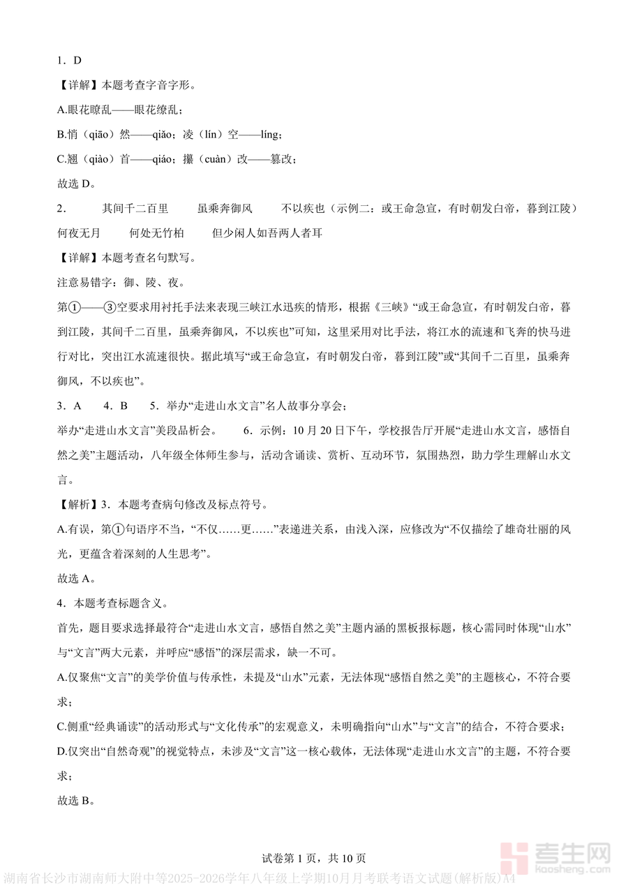 《湖南省长沙市湖南师大附中等2025-2026学年八年级上学期10月月考联考语文试题(解析版)A4.pdf》是一份聚焦八年级上学期语文核心考点、贴合本地名校联考命题趋势的高质量备考资料。文件包含完整试题卷及逐题详细解析内容,覆盖字音字形辨析、名句默写、阅读理解(含现代文与文言文)、综合实践活动等典型题型;解析部分不仅明确答案正误,还针对易错点(如字音误读、字形混淆、病句修改逻辑)给出专业阐释,并结合教材知识点延伸解题思路(如名句默写的情境提示、阅读理解的答题框架),体现真题解析的深度与实用性。