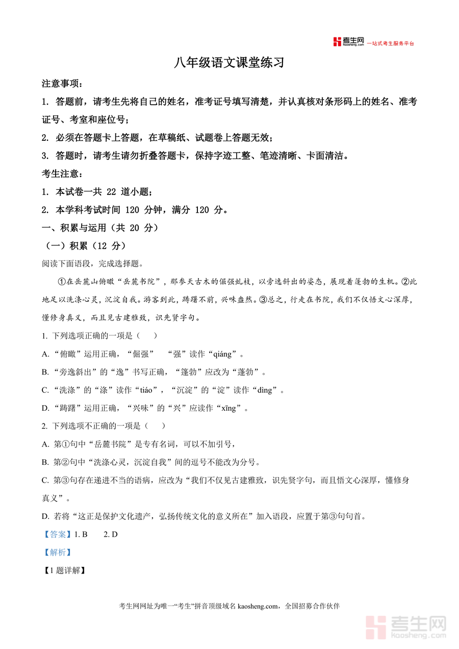 《精品解析:湖南省长沙市一中初级中学2025-2026学年八年级上学期第三次月考语文试题(解析版).docx》是一份聚焦该校八年级上学期第三次月考的语文真题解析资料,涵盖积累与运用、阅读与鉴赏等核心模块,包含字音字形辨析、文学文化常识识记、古诗文默写、综合性学习及非连续性文本阅读等典型题型,每个题目均配备精准答案与深度解析,解析不仅明确考点指向,还梳理解题逻辑与易错点,帮助学生理解命题意图,突出真题解析与考点强化相结合特色。