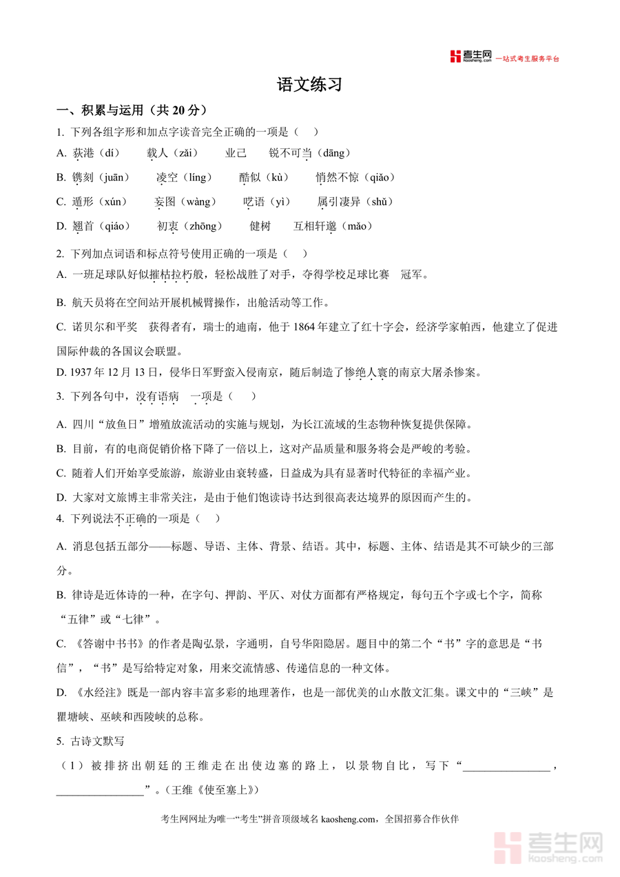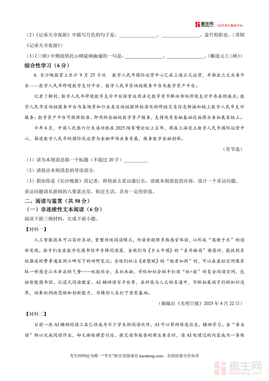 《精品解析:湖南省长沙市北雅中学2025-2026学年八年级上学期第一次月考语文试题(原卷版).docx》是一份针对北雅中学八年级上学期首次月考设计 的语文备考资料,内容覆盖积累与运用(字音字形辨析、标点符号使用、病句修改、古诗文默写等)及阅读与鉴赏(非连续性文本阅读、现代文阅读)两大核心板块;题型设置严格贴合课标要求与该校教学进度,精准呈现本地名校月考命题特点,保留真实考试场景下的练习形式,为学生提供沉浸式备考素材。