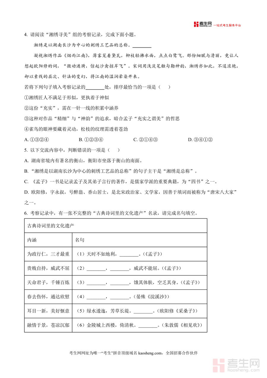 《精品解析:湖南省长沙市开福区青竹湖湘一外国语学校2025-2026学年八年级上学期12月月考语文试题(原卷版)(1).docx》是一份针对该校八年级上学期12月月考的权威真题资料,主要内容涵盖基础运用(如字音字形辨析、成语选择、病句修改)、阅读鉴赏(非连续性文本阅读、文学作品《遥远向日葵地》阅读分析、名著《红岩》阅读、古诗文阅读)等核心题型,特色亮点在于融入湘绣非遗文化专题学习活动设计题目,结合教材考点,题型设置贴合课标要求与学校教学实际,能全面检测学生语文知识掌握情况及综合应用能力。