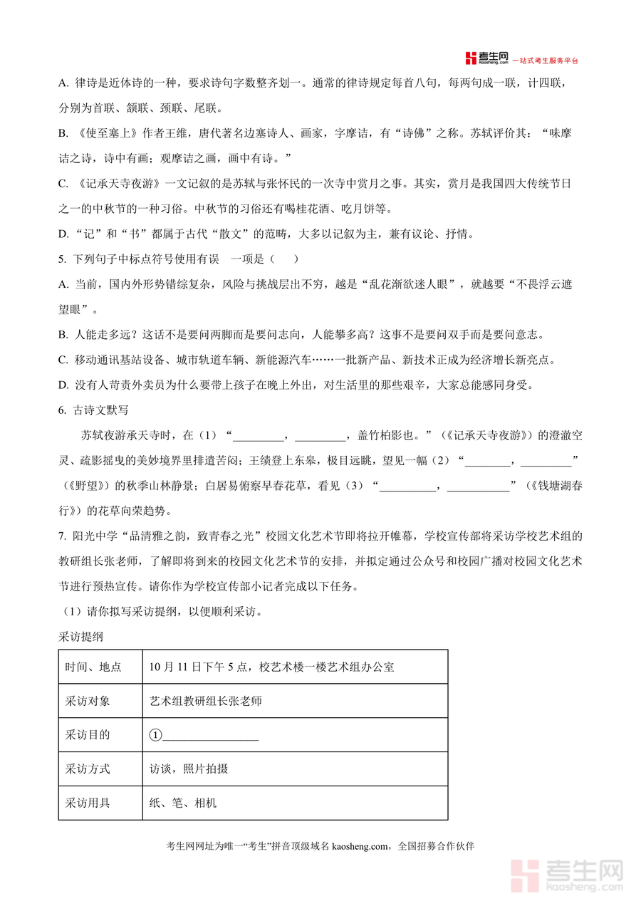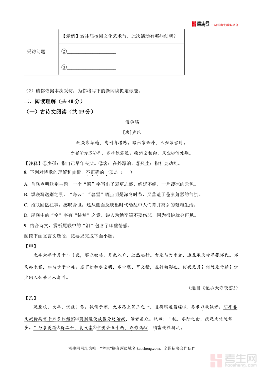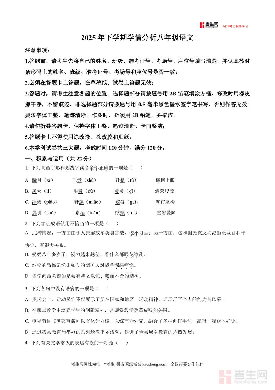 《精品解析:湖南省长沙市郡系2025-2026学年八年级上学期10月月考语文试题(原卷版).docx》是一份长沙郡系优质初中阶段性学情分析的原始试卷文档,核心定位为区域标杆性测评资料,主要内容涵盖积累与运用(字音字形、成语运用、病句辨析等)、阅读理解(古诗文阅读含卢纶《送李端》及苏轼《记承天寺夜游》等经典篇目,现代文阅读涉及长沙米粉文化及记叙文《田叙》)、古诗文默写等三大模块,特色亮点在于严格遵循本地考试规范(如答题卡使用要求)、贴合郡系教学进度与难度梯度,保留真实考试场景细节(如注意事项及题型分布),为使用者提供原汁原味的测评体验。