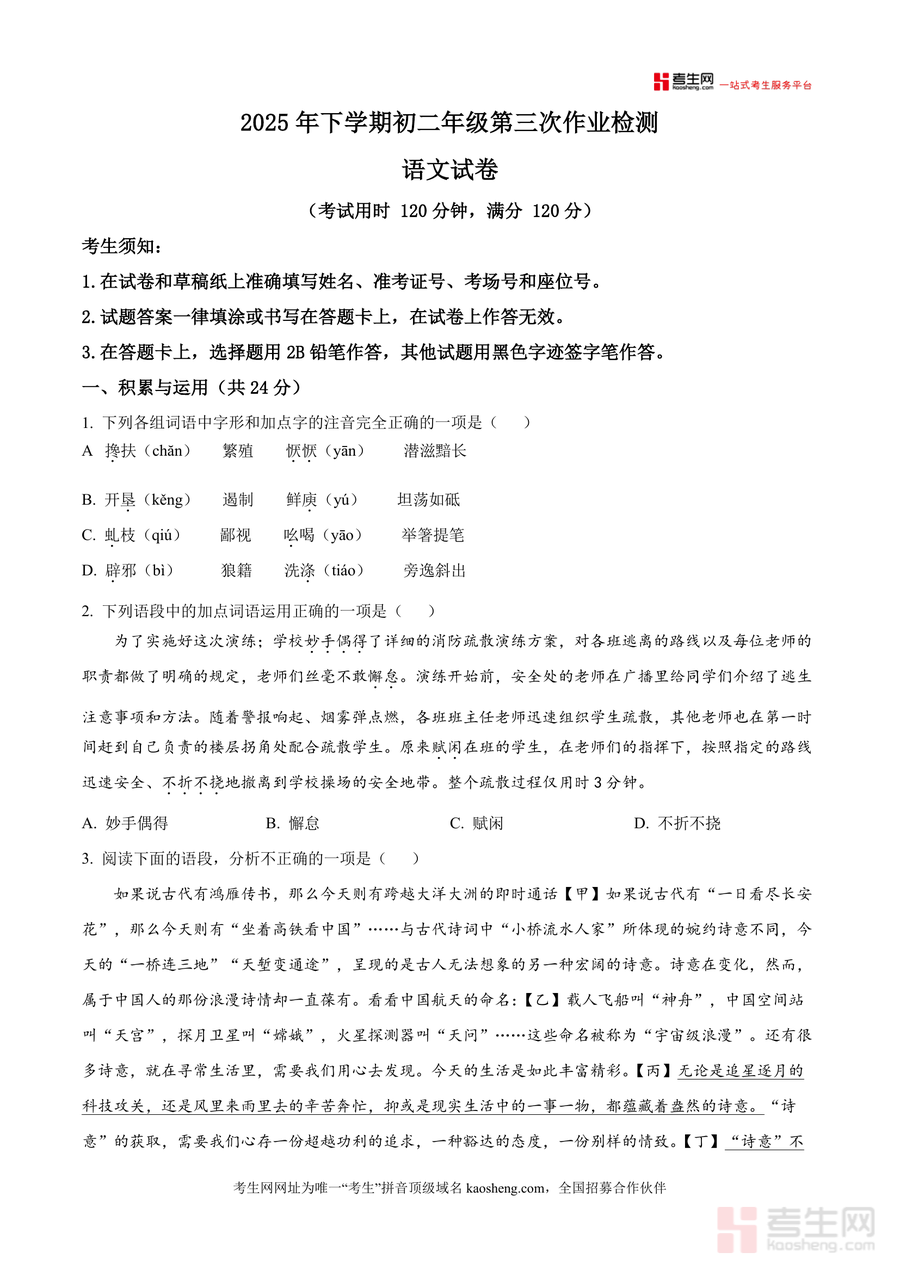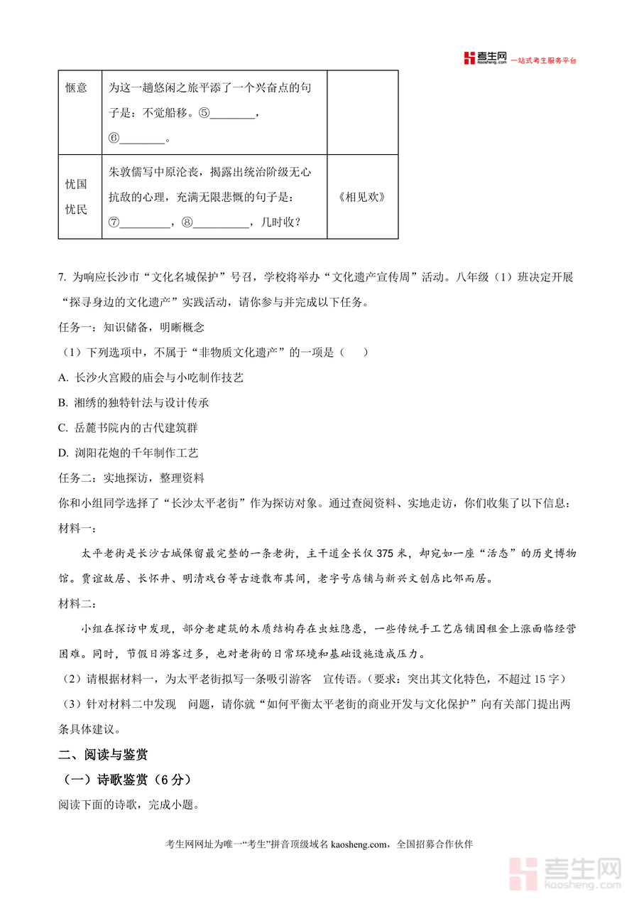 《精品解析:湖南省长沙市长郡梅溪湖中学2025-2026学年八年级上学期第三次月考语文试题(原卷版)》是一份面向八年级上学期学生设计的标准化语文备考资料,依托长郡梅溪湖中学优质教学资源编制而成核心内容覆盖积累与运用板块含字词注音字形辨析、成语运用正误判断病句修改及文学常识考查等题型;阅读与鉴赏板块包含杜甫诗歌鉴赏、柳宗元相关文言文阅读及李汉荣散文《转身》现代文阅读;综合性学习板块围绕文化遗产保护主题设计实践任务整体题型设置贴合长沙中考命题趋势与校内教学进度高度匹配能有效还原真实考试场景助力学生提升真题解析能力。