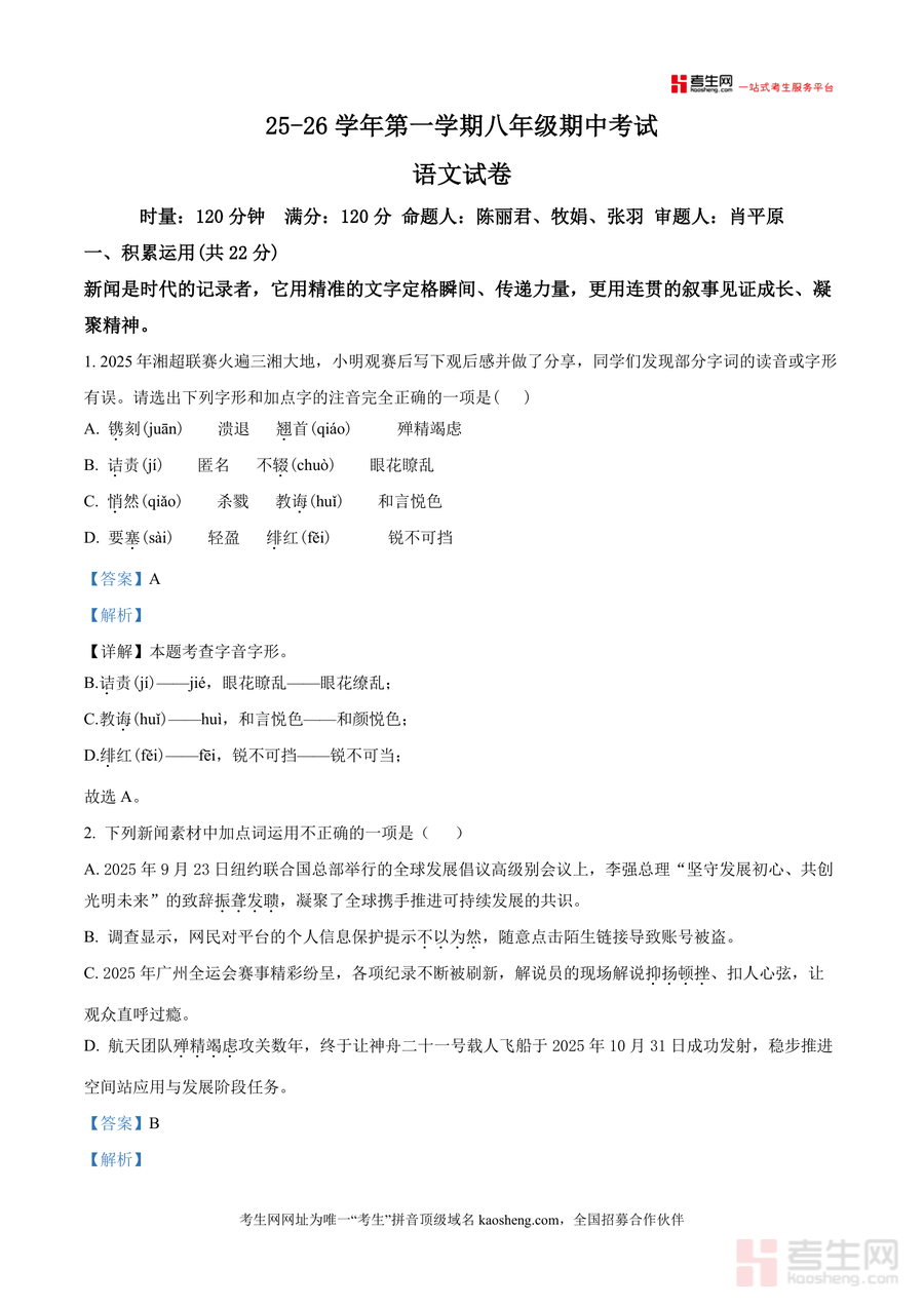 《精品解析:湖南省长沙市明德集团联考2025-2026学年八年级上学期11月期中语文试题(解析版)》是一份针对区域联考设计专业真题解析资料涵盖积累运用、古诗文默写、综合运用等核心模块内容特色在于逐题拆解考点如字音字形辨析、成语运用规范病句修改逻辑等解析精准且融入湘超联赛神舟二十一号发射等最新时事素材帮助学生理解考点实际应用场景同时提供清晰答题思路和错误原因分析助力学生掌握知识本质