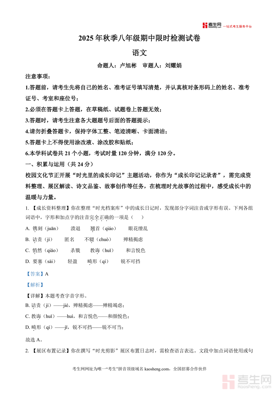 《精品解析:湖南省长沙市长郡集团初中校2025-2026学年八年级上学期期中语文试题(解析版).docx》是一份针对八年级上学期语文期中备考的权威真题解析资料,主要涵盖积累与运用(字音字形辨析、病句修改、句子排序等)、文学类文本阅读、古诗文默写及主题活动设计等核心题型,特色亮点在于每道题均配有详细解析,包括考点定位、错误选项辨析及答题思路指引,能帮助学生精准掌握知识点细节,是兼具实用性与权威性的备考资料。