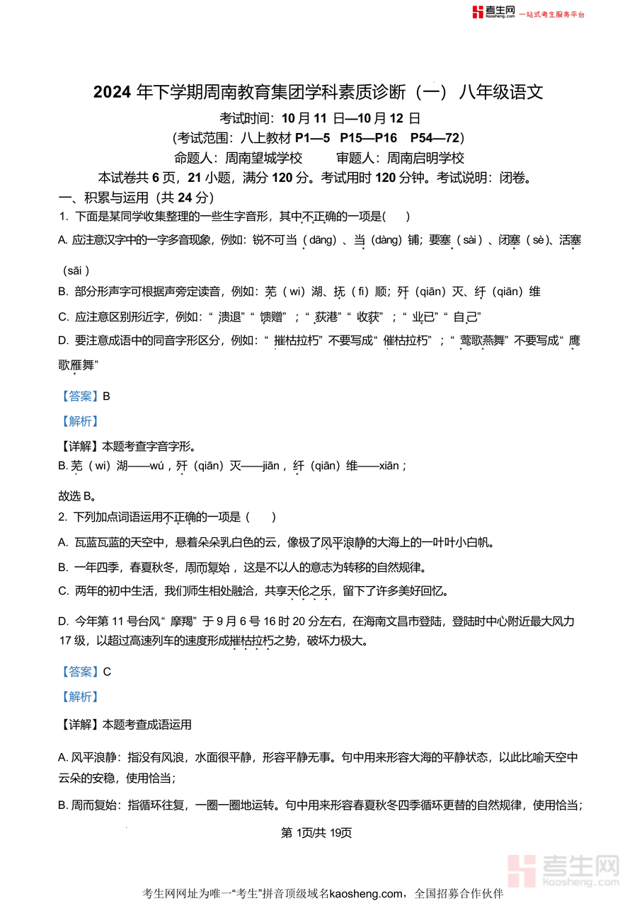 本资料尤其适合长沙周南教育集团及周边区域八年级学生使用,也可供其他地区同类学段学生参考借鉴。其依托真实期末真题与专业解析,兼具针对性与实用性,是提升语文应试能力、高效备考期末考的必备资料,长期来看能帮助学生构建完整语文知识体系,增强学科核心素养,具有不可替代的学习价值与指导意义。