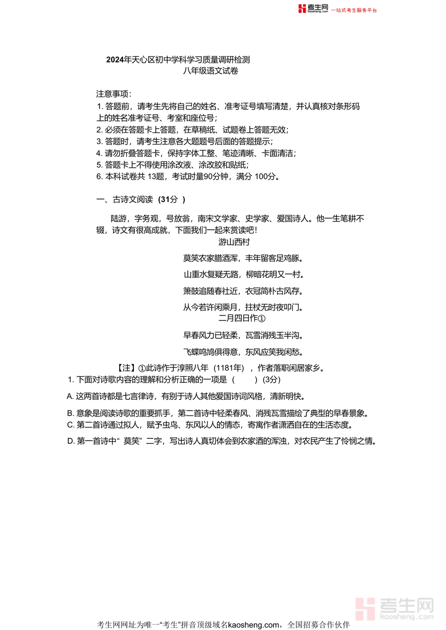 本试卷适用于长沙市天心区及周边区域八年级学生、初中语文教师及关注孩子学业家长.作为区域官方教研检测资料,它真实反映本地语文教学评价趋势,提供贴合实际需求的练习素材,不可替代性体现在对区域命题风格的精准呈现,长期使用可帮助学生形成系统语文应试策略,为后续九年级中考备考奠定坚实基础,是提升语文核心素养与应试能力的必备资料.