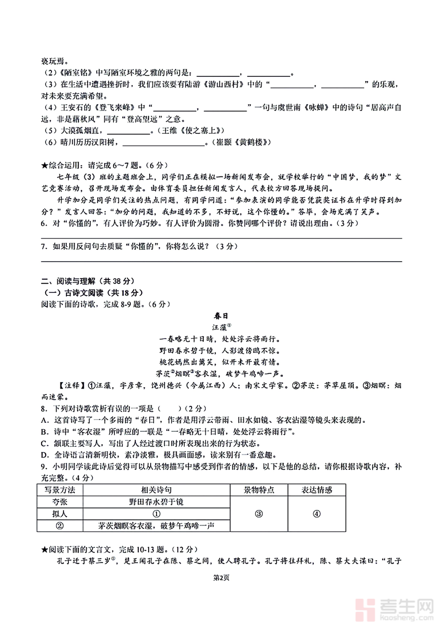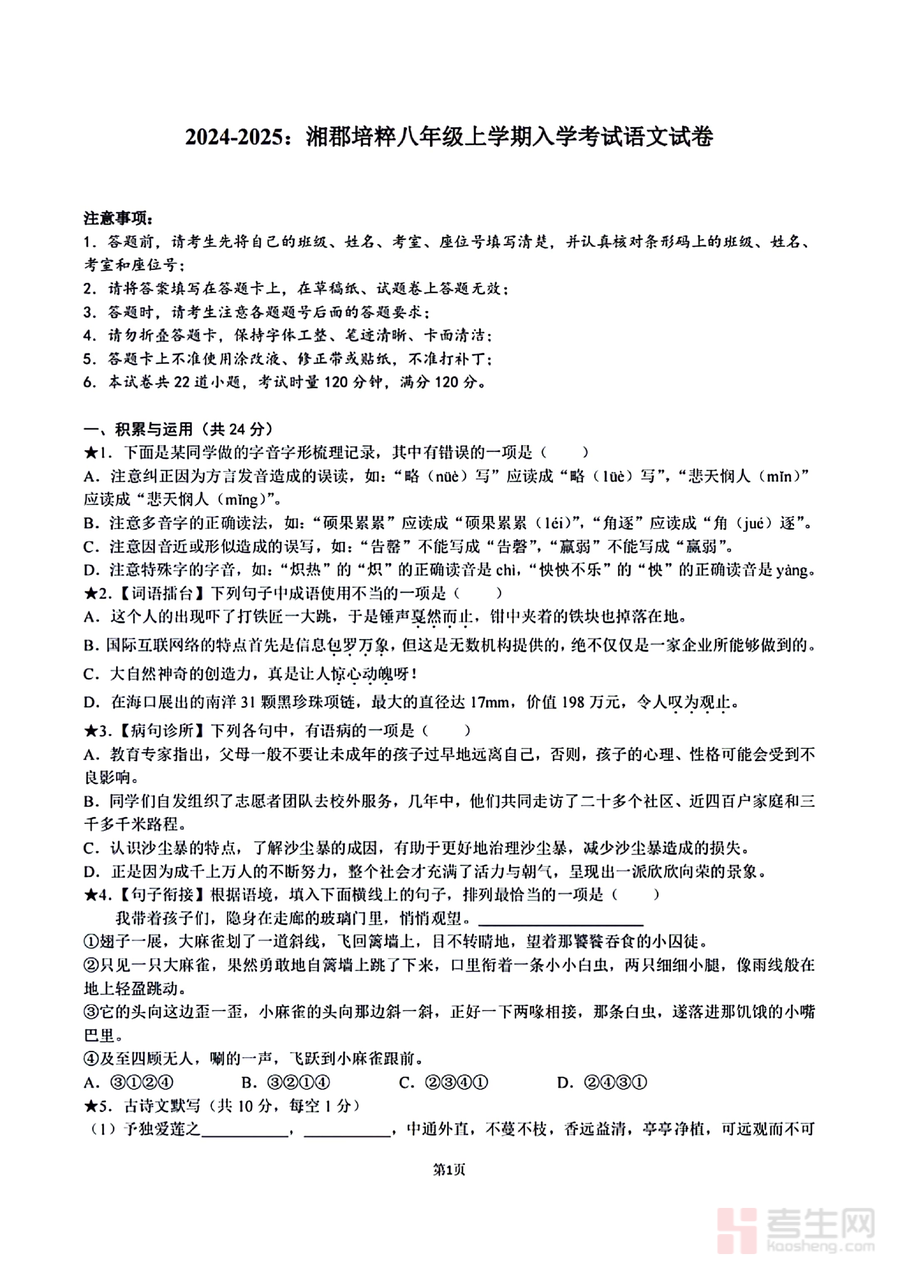 本资料适用于长沙市湘郡培粹实验中学及周边同类学校的八年级学生、初中语文教师及关注孩子语文学习的家长。作为开学阶段关键备考资料,它能帮助学生提前适应新学期测试要求,弥补知识漏洞;其不可替代性体现在名校真题的稀缺性与权威性,为后续八年级语文学习提供明确方向;长期价值在于培养学生自主检测习惯与应试思维,为整个学年语文学习奠定坚实基础。