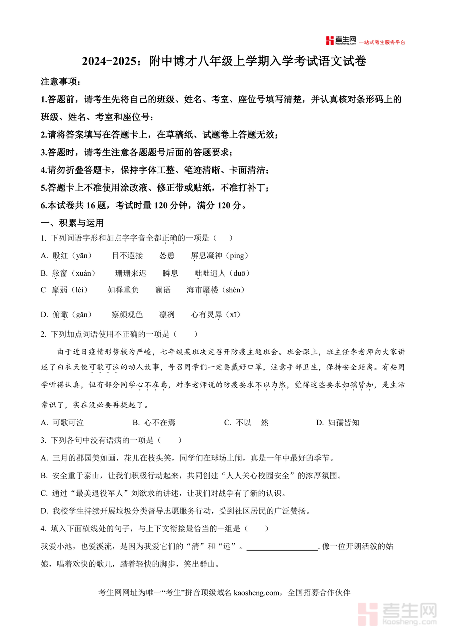 《精品解析:湖南省长沙市师大附中博才实验中学2024-2025学年八年级上学期开学考试语文试题(原卷版).docx》是一份聚焦长沙本地优质校开学考命题特点、服务八年级学生语文备考的核心资料。文件以原卷形式完整呈现该校最新开学考试语文试卷,涵盖积累与运用(字音字形、词语运用、病句辨析等)、古诗文默写与阅读、文言文阅读、现代文阅读及名著阅读等初中语文核心模块题型,精准贴合该校教学进度与考核重点;作为权威备考资料,其内容严格遵循部编版教材要求,通过真实真题情境帮助学生快速掌握考点分布规律,为后续学习与应试能力提升奠定基础。