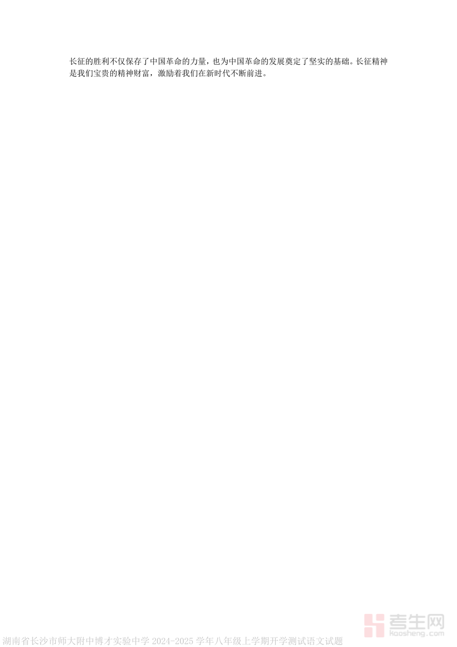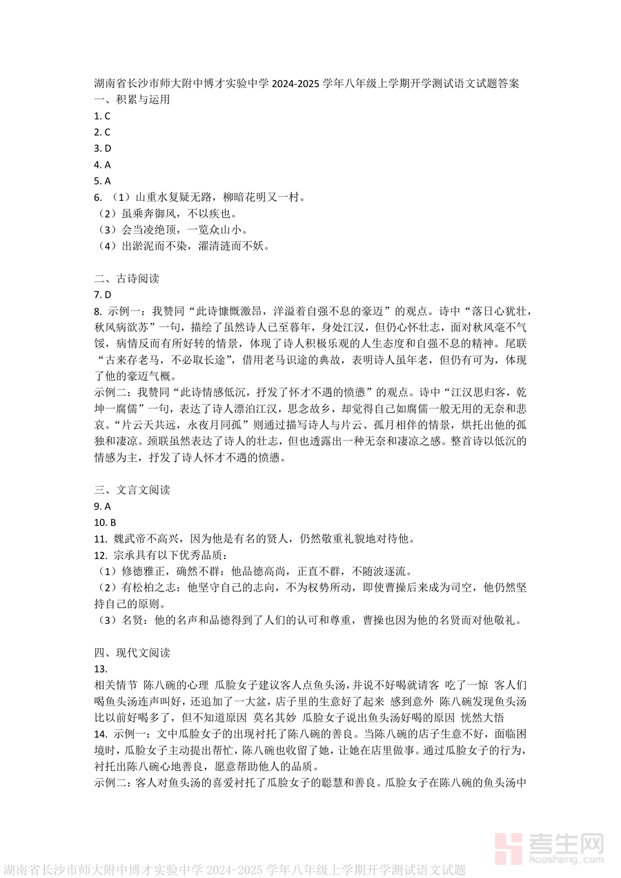 《湖南省长沙市师大附中博才实验中学2024-2025学年八年级上学期开学测试语文试题答案.pdf》是一份针对该校八年级学生开学语文测试设计的权威参考答案与深度解析资料。文件覆盖积累与运用、古诗阅读、文言文阅读、现代文阅读及名著阅读五大核心板块,不仅提供精准答案,更包含详实解析——如古诗《江汉》两种情感倾向的对比分析、文言文《宗承传》人物品质提炼与翻译要点说明、现代文《陈八碗》的情节梳理与主题感悟拓展等;解析过程融入文本细读方法与答题逻辑(如名著阅读中领袖人物形象分析路径),既呈现正确答案又引导思维训练;作为该校实际测试配套资料(真题解析),其内容贴合学情与考试要求,为学生提供专业学习参考依据。