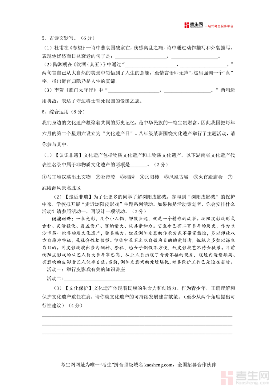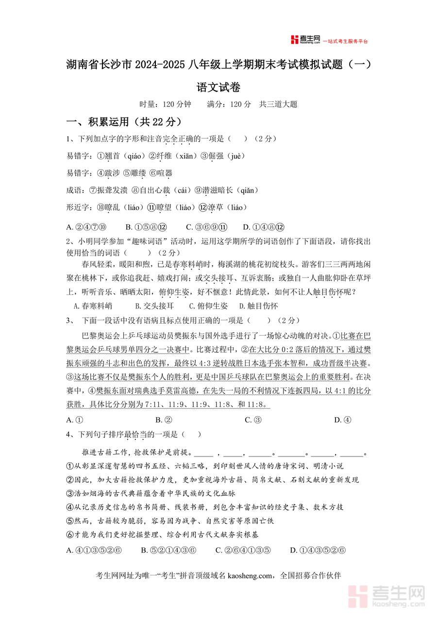 《湖南省长沙市2024-2025八年级上学期期末考试语文模拟试题(一)(原卷版).docx》是一份针对长沙市八年级学生设计的期末语文模拟备考资料,核心定位为贴合本地考情、覆盖核心考点的实战训练载体。内容涵盖积累运用模块(含字音字形辨析、成语运用判断、病句修改、古诗文默写及非遗相关综合运用题)、古诗文阅读鉴赏模块及说明文阅读模块;特色亮点在于精准对接长沙期末考纲要求,融入浏阳皮影戏、湘绣等本地非遗元素,题型结构与真题高度一致,并设置典型易错点考查(如翘首读音、自出心裁字形等),兼具基础巩固与能力提升功能.