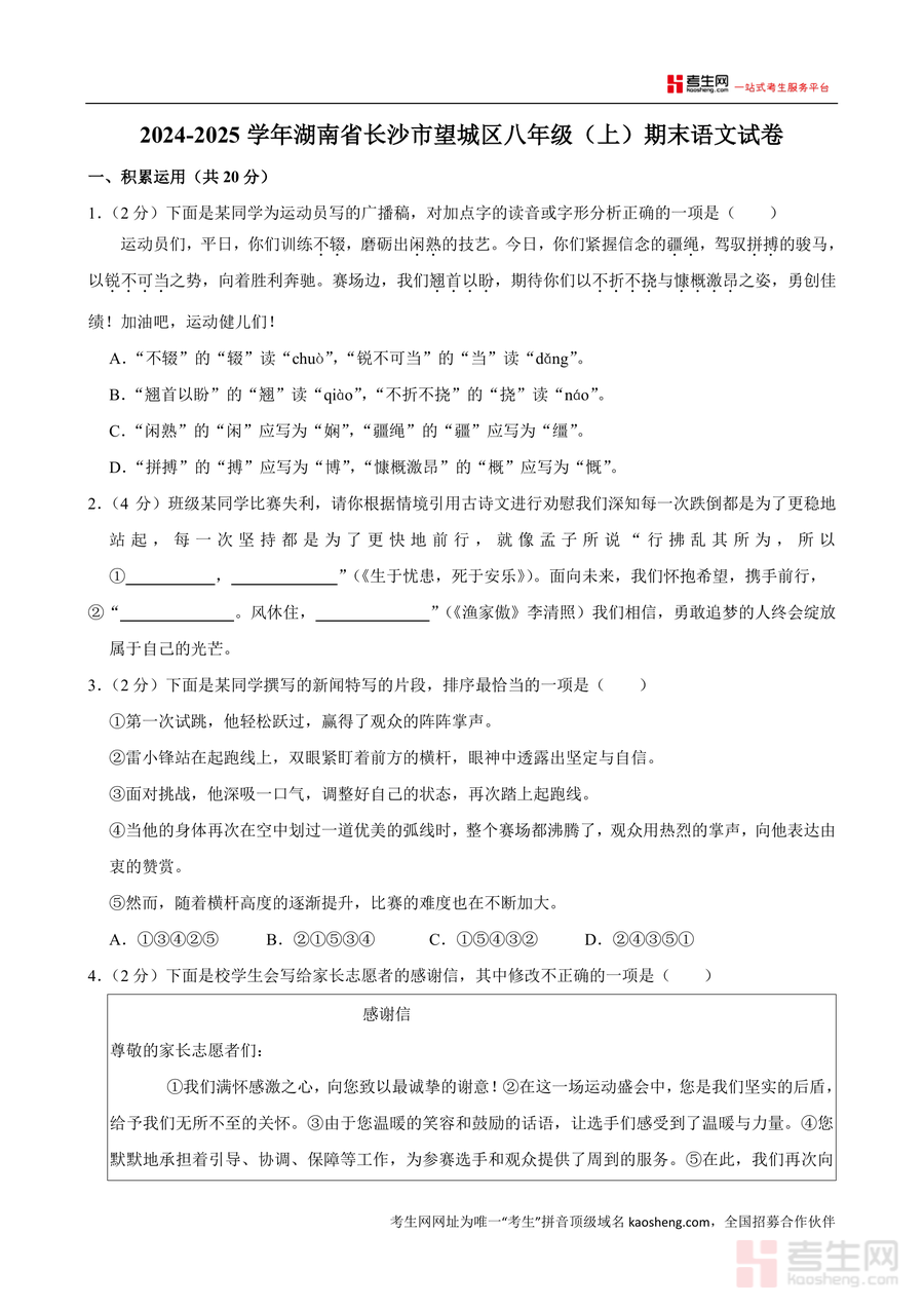 《湖南省长沙市望城区2024-2025学年八年级上学期1月期末语文试题.docx》是一份聚焦区域期末检测需求的权威真题资料,涵盖积累运用(字音字形辨析、古诗文默写、情境化语言运用等)、阅读理解(古代诗歌鉴赏、文言文阅读、非连续性文本分析、现代文阅读)等核心考查模块。其特色在于贴合望城区本地教学大纲与命题趋势,题型设置兼顾基础知识点夯实与综合能力拓展,如积累运用中融入运动员广播稿纠错、古诗文劝慰情境等生活化题目,阅读理解选取望城铜官窑非遗素材及高原烈士主题现代文,既考查知识掌握又渗透文化素养培育,能真实反映区域期末检测的考查重点与难度梯度,为备考提供精准参考方向.