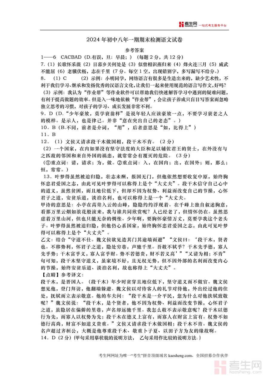 《湖南省长沙市长沙县2024-2025学年八年级上学期1月期末语文试题答案.docx》是一份针对该地区八年级上学期期末语文考试的权威参考答案资料,覆盖全卷选择题、古诗文默写、语言运用题、文言文阅读、现代文阅读、名著阅读及作文评分等所有题型。其特色亮点在于解析详实且针对性强:选择题标注错误选项原因,古诗文默写明确错别字扣分规则,文言文提供关键词翻译及整句译文,现代文阅读分析修辞手法与表达效果,作文部分给出清晰评分标准及基准分设定,全面贴合本地教学实际与考试要求。