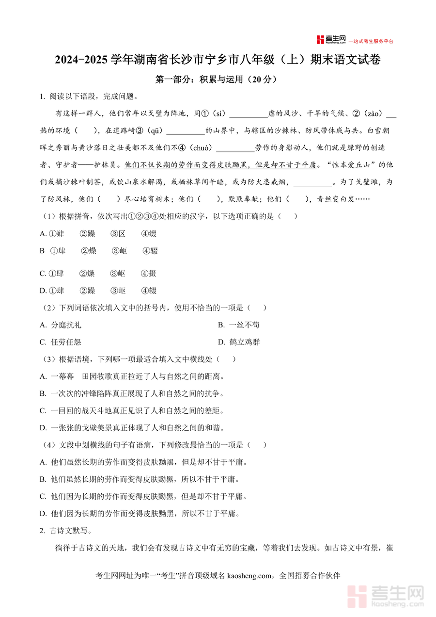 《精品解析:湖南省长沙市宁乡市2024-2025学年八年级上学期期末语文试题(原卷版).docx》是一份针对湖南省长沙市宁乡市八年级学生设计的期末语文考试真题资料,包含积累与运用、古诗文阅读、实用类文本阅读等多个板块,紧密贴合当地教学大纲要求,反映最新考试趋势与命题方向,为学生提供真实考试环境的体验机会,帮助学生全面了解考试题型、难度分布及评分标准,是一份专业可靠的真题解析资料。