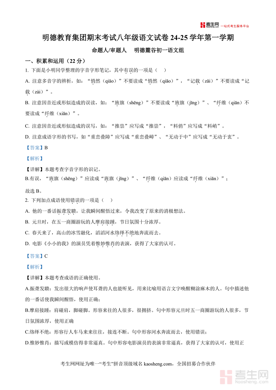 《精品解析:湖南省长沙市明德教育集团2024-2025学年八年级上学期期末语文试题(解析版).docx》是一份聚焦本地考情、服务八年级语文学习的权威真题解析类备考资料,涵盖积累与运用(字音字形、成语使用、病句辨析等)、阅读与鉴赏(古诗文、现代文)、综合性学习等核心模块,解析内容详实且针对性强——如字音字形题针对多音字"悄然""记载"的误读、形似字"推崇""料峭"的误写做深度辨析;成语题结合"络绎不绝"等误用案例拆解语境适配逻辑,帮助学生精准把握考点本质.