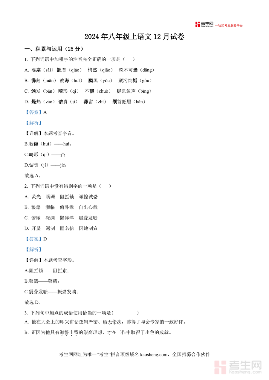 《精品解析:湖南省长沙市第十一中学2024-2025学年八年级上学期期末语文试题(解析版)》是一份针对该校八年级上学期期末语文考试设计精准备考资料,主要覆盖积累与运用(字音字形辨析、成语运用判断、文学常识识记等)、古诗文默写与阅读、综合性学习等全题型模块;特色亮点在于解析深度贴合学情,不仅提供标准答案,更针对高频易错点如"教诲"读音误区、"狼籍"字形纠正做专项点拨,并融入答题思路引导,帮助学生理解考点本质而非机械记忆.