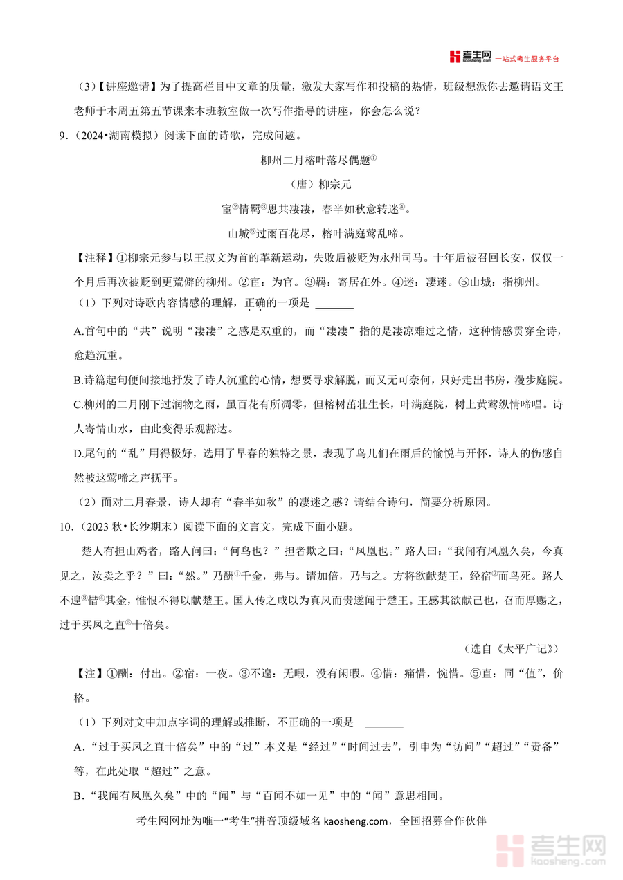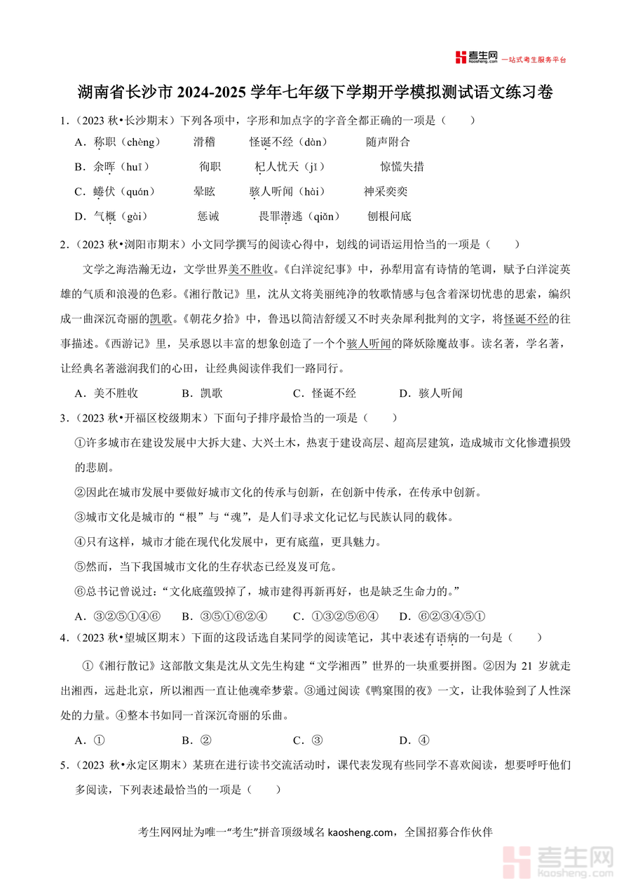 本练习卷适用于长沙市七年级下学期在读学生及需进行七年级上学期知识巩固与开学衔接复习的同类学生作为开学适应性模拟测试资料它能助力学生实现假期到课堂学习的平稳过渡是开学前必备复习资源其不可替代性在于结合本地考情设计内容精准匹配学生需求长期价值体现在为七年级下册语文学习奠定坚实知识基础持续提升学生语文综合素养