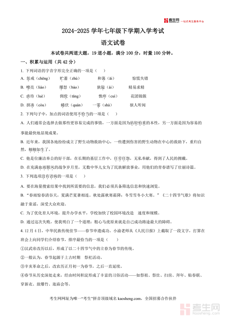 《精品解析:湖南省长沙市南雅中学2024-2025学年七年级下学期入学考试语文试题(原卷版).docx》是一份针对初中七年级学生语文入学考试的专业备考资料,核心定位为贴合南雅中学命题风格与难度的真题资源,主要内容覆盖积累与运用(字音字形辨析、词语运用、病句修改等)、古诗文阅读(诗歌赏析、文言文理解)及文学作品阅读三大板块,特色亮点在于严格遵循南雅中学入学考的题型设置与知识点分布,精准呈现七年级语文核心考点,为学生提供真实的考试场景参考。