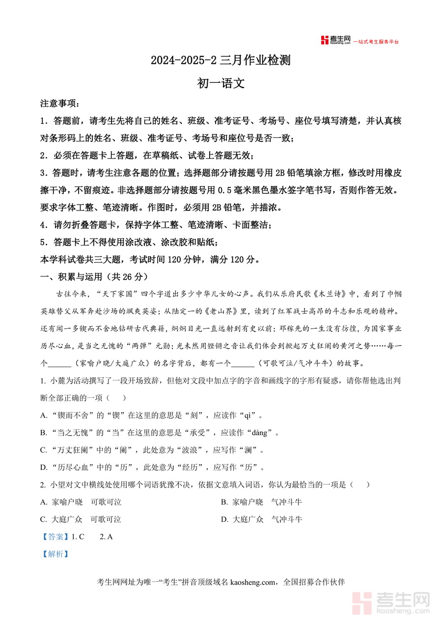 该资料核心用途为辅助七年级学生巩固下册语文基础知识、提升应试能力,适用场景包括学生自主完成月考真题后的错题复盘(通过解析明确错误原因)、教师备课参考命题方向与解析方法、家长辅导孩子时提供专业知识支撑;用户价值体现在精准覆盖月考高频考点(如《木兰诗》相关默写与文学常识),助力学生查漏补缺;备考优势在于其真题来源的权威性与解析内容的实用性,能有效缩短学生从"会做一道题"到"掌握一类题"转化时间,强化知识迁移能力.