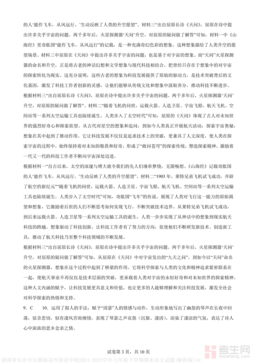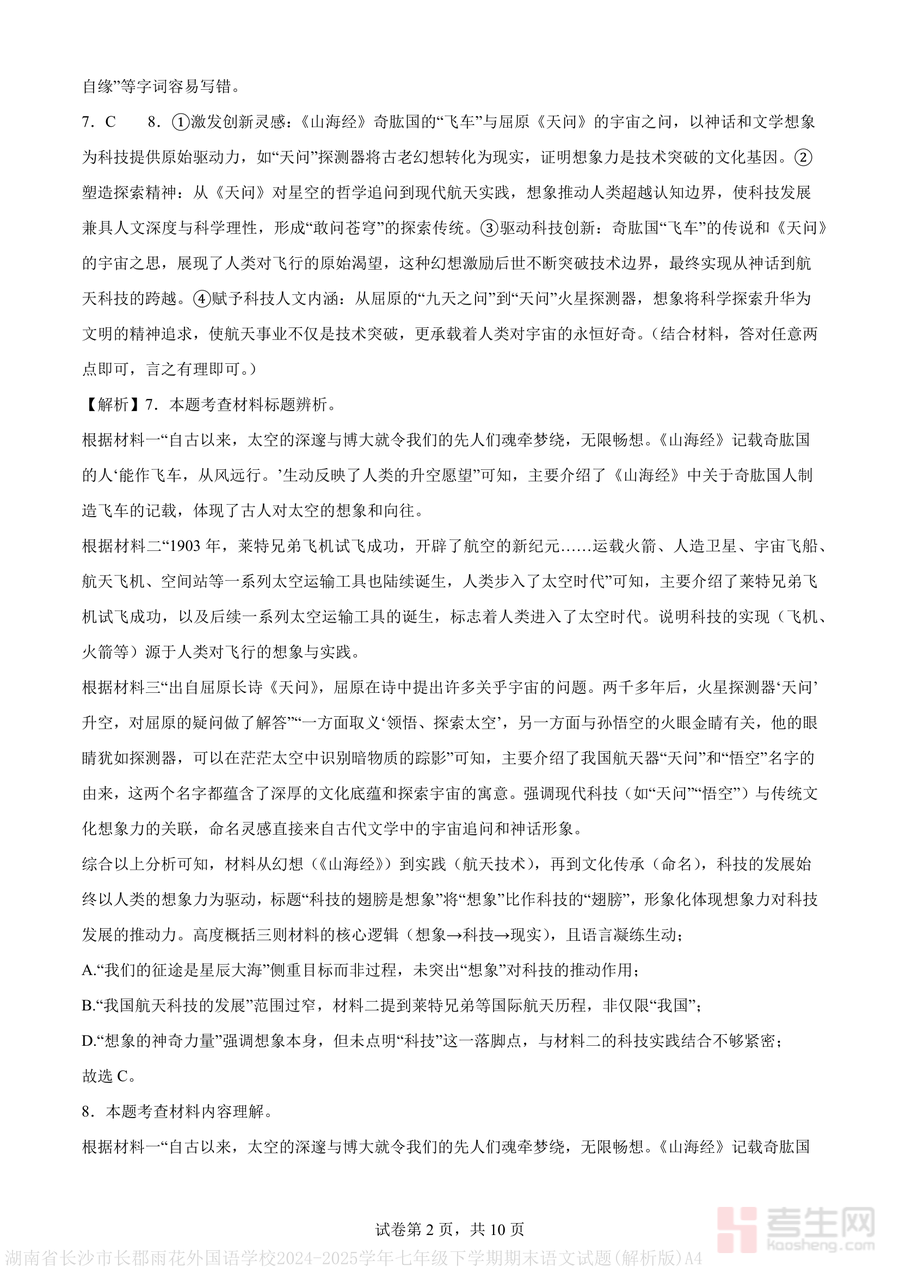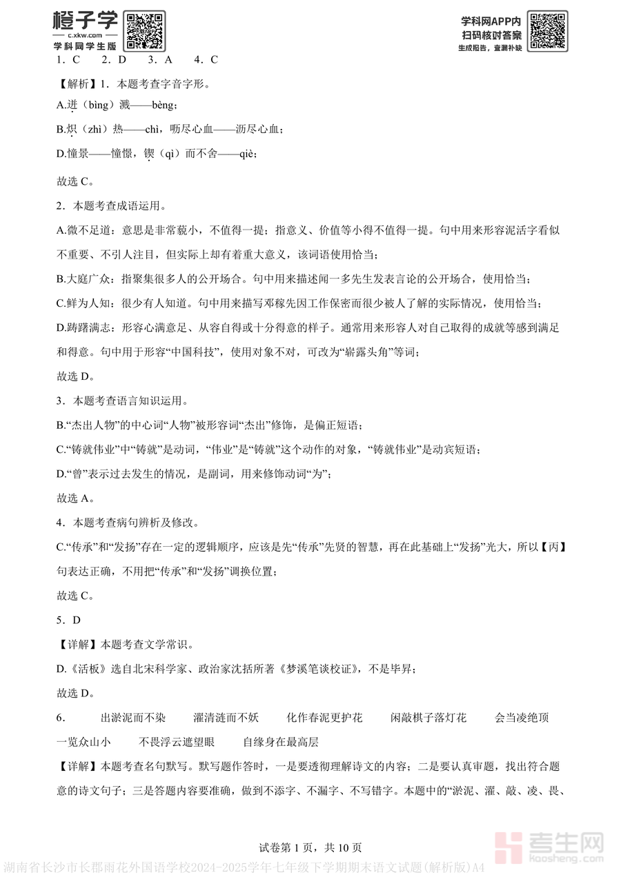 《湖南省长沙市长郡雨花外国语学校2024-2025学年七年级下学期期末语文试题(解析版)A4.pdf》是一份聚焦七年级下学期语文核心考点、依托名校命题资源打造的真题解析类备考资料,涵盖字音字形、成语运用、语言知识运用等基础题型,以及名句默写、现代文阅读(含非连续性文本)、古诗文阅读等综合题型;其特色在于每道题均配备深度解析,不仅标注正确答案,更针对错误选项进行根源性修正(如字音题明确易错读音的声母韵母差异),古诗文阅读题结合文本背景与修辞手法分析情感内涵,帮助学生理解考点本质而非机械记忆.