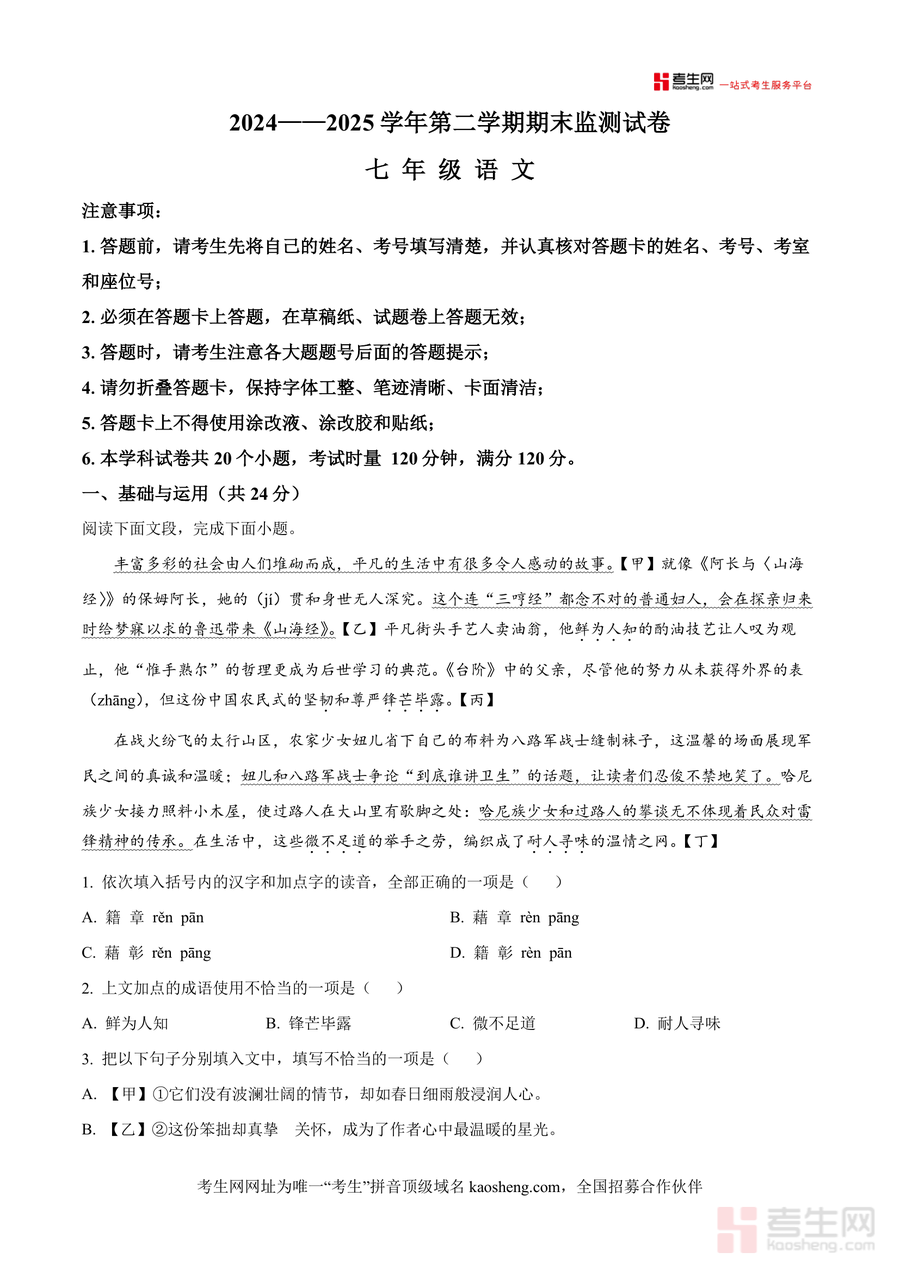 《精品解析:湖南省长沙市长沙市一中教育集团2024-2025学年七年级下学期期末语文试题(原卷版).docx》是一份区域名校权威期末测评资料,完整呈现长沙一中教育集团七年级下学期语文期末试题原貌及考查要点。内容涵盖基础与运用(字音字形、成语运用、病句修改等)、阅读与鉴赏(古诗文阅读、文学类文本阅读、整本书阅读)、古诗文默写及综合性学习等核心模块,题型设置贴合部编版教材七年级下册教学目标及当地考试命题趋势,能精准反映区域名校对学生语文核心素养与基础知识考查方向。