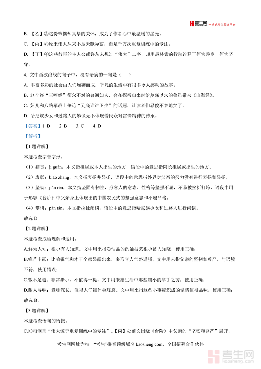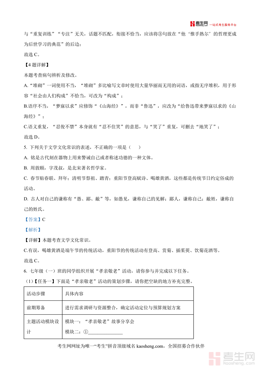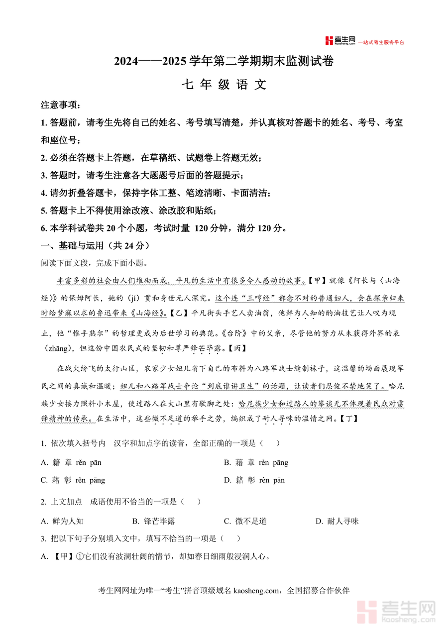 《精品解析:湖南省长沙市长沙市一中教育集团2024-2025学年七年级下学期期末语文试题(解析版).docx》是一份针对长沙一中教育集团七年级下学期期末语文真题编制的专业备考资料,主要涵盖基础与运用(字音字形、成语运用、病句辨析等)、古诗文默写与鉴赏(含诗词分析及文学文化常识)、综合性学习(如"孝亲敬老"活动设计)等全卷题型;其特色亮点在于每道题配备详实解析,包括字音字形规范依据、成语使用语境适配性分析、病句修改语法逻辑梳理,以及古诗文鉴赏中的情感解读与考点关联,助力学生深入理解命题意图而非机械记忆答案.