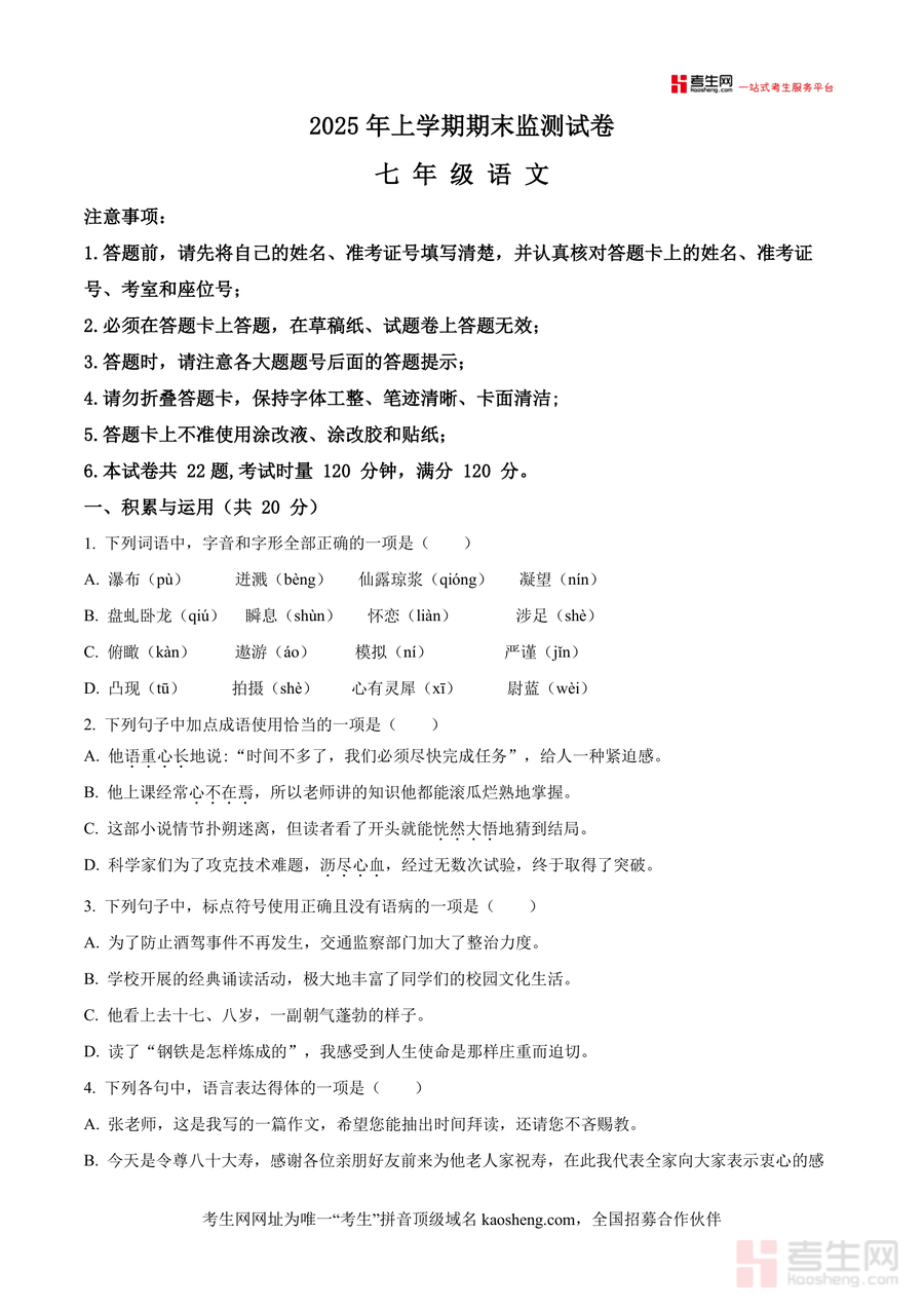 《精品解析:湖南省长沙市雨花区稻田中学2024-2025学年七年级下学期期末语文试题(原卷版)docx》是一份聚焦长沙本地七年级期末语文备考核心需求的专业资料定位精准内容完整涵盖考试时长120分钟满分120分的全题型结构包含积累与运用(字音字形辨析、成语使用、标点语病判断等)、阅读与理解(古诗鉴赏、文言文阅读、非连续文本分析等)模块特色亮点在于依托本地名校真题资源贴合校考命题方向能为考生提供真实考试场景的训练素材是优质备考资料
