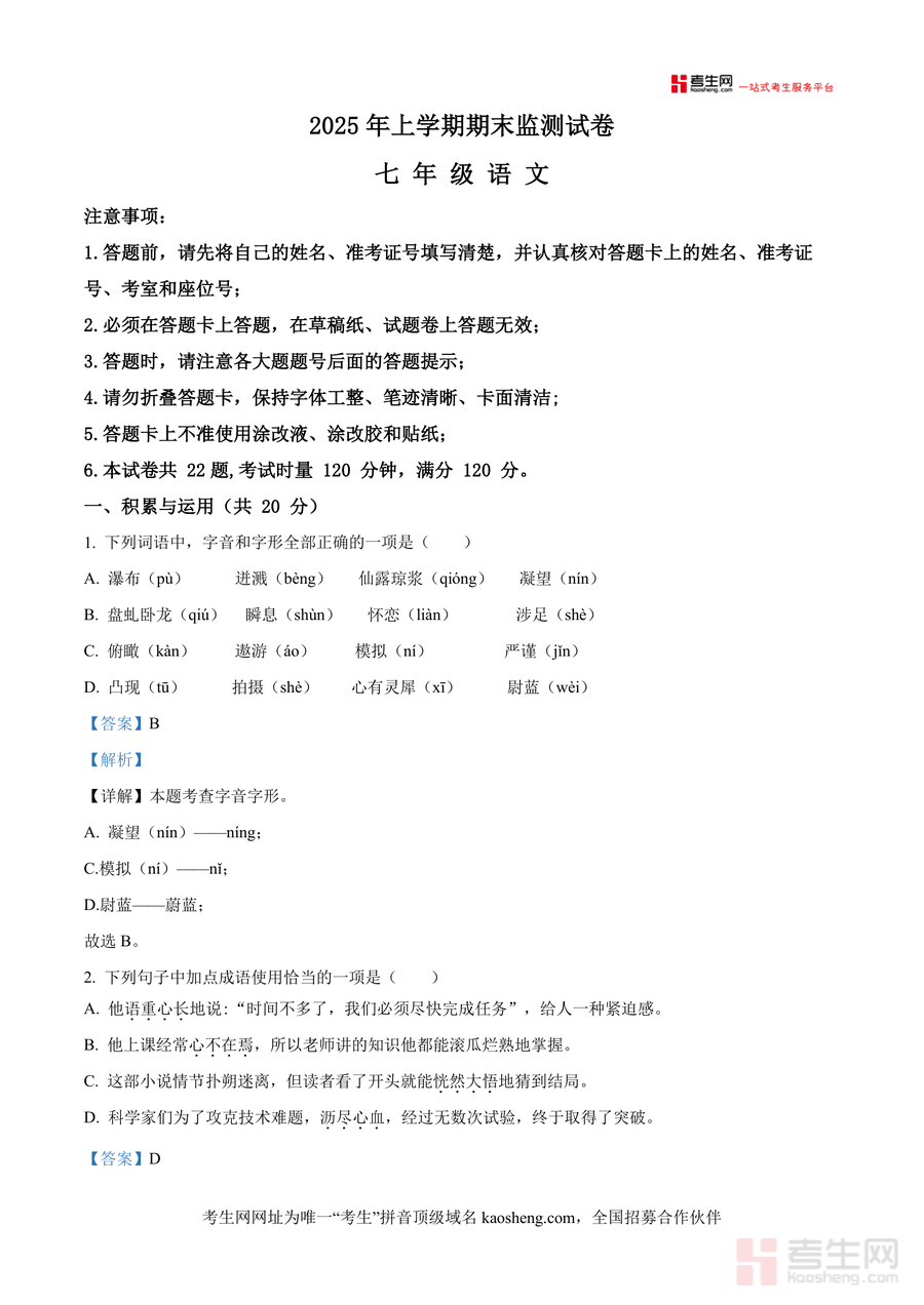 本资料适用人群为湖南省长沙市雨花区稻田中学七年级在读学生及语文教师,其必要性在于精准贴合校考命题方向,不可替代性体现在真题资源与本地化解析相结合,长期价值则在于帮助学生夯实语文基础并构建系统化知识框架,为后续初中阶段语文学习奠定坚实基础,是期末备考不可或缺的专业资料工具。