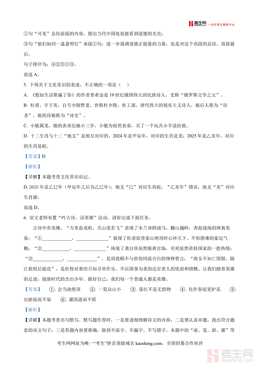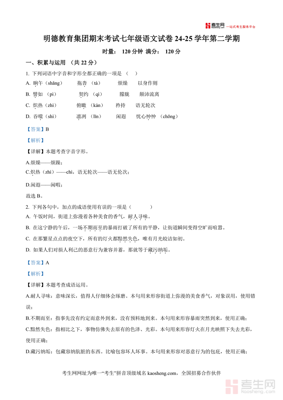 《精品解析:湖南长沙明德教育集团2024-2025学年七年级下期期末语文试题(解析版)》是一份针对七年级语文期末备考需求打造的专业资料核心定位为明德教育集团及区域内七年级学生提供精准的真题解析服务主要内容覆盖积累与运用、阅读与理解等核心模块特色亮点在于每道题均配备详实解析不仅明确答案还深度剖析考点、易错点及解题思路如字音字形题标注常见错误类型古诗文题融入背景解读与情感分析文化常识题补充相关拓展知识助力学生全面掌握知识点