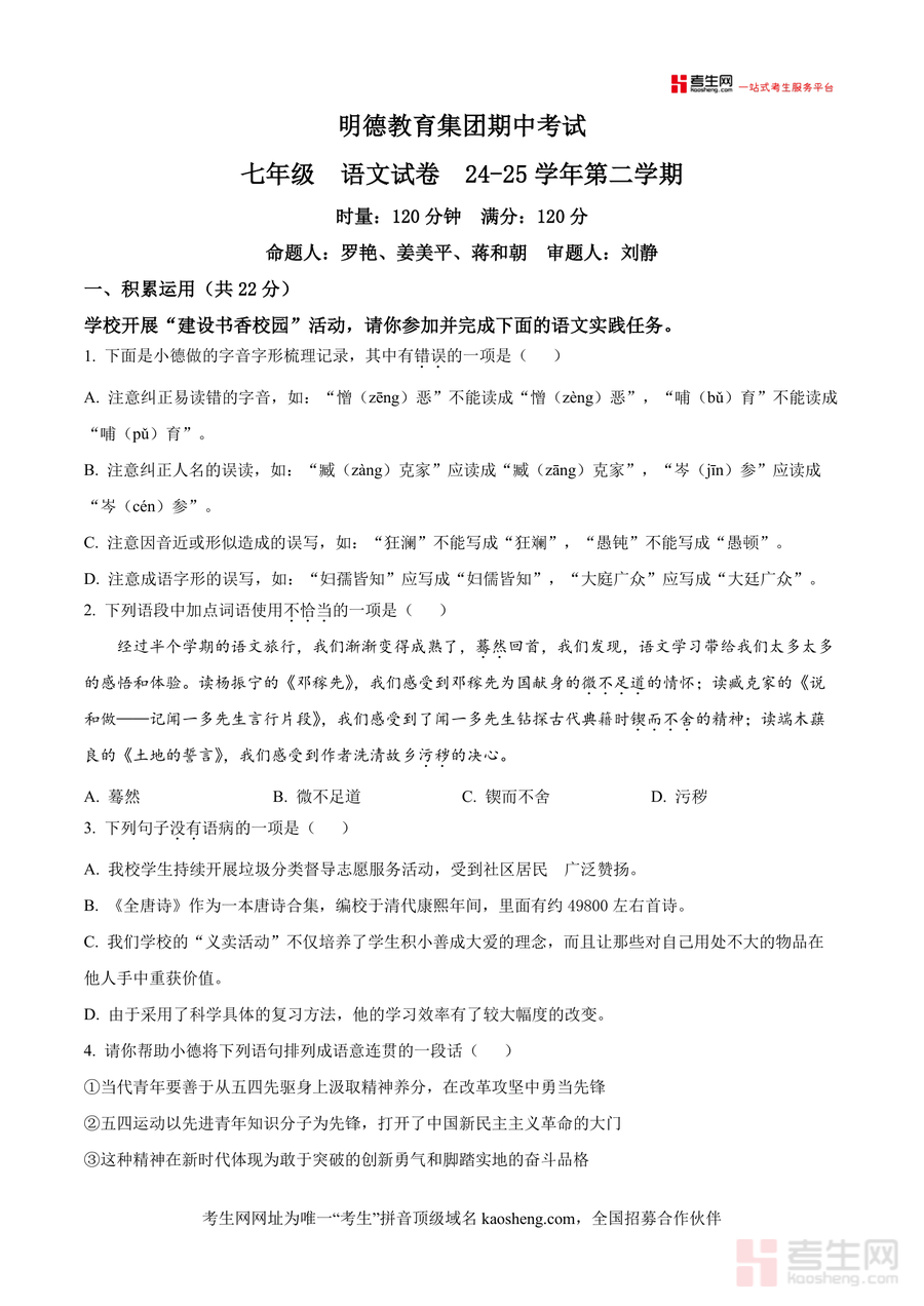适用人群为长沙市明德教育集团七年级学生及周边区域同步教学进度的七年级学生,也适用于所有备战七年级下学期期中语文考试需提升实战能力者;该文件具有不可替代必要性,因其直接对接本地教学重点与考试方向,长期价值在于帮助学生积累典型题型经验,夯实语文基础,为后续学习与素养提升提供有力支撑,是七年级期中语文备考的重要资料之一。