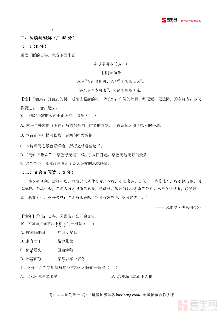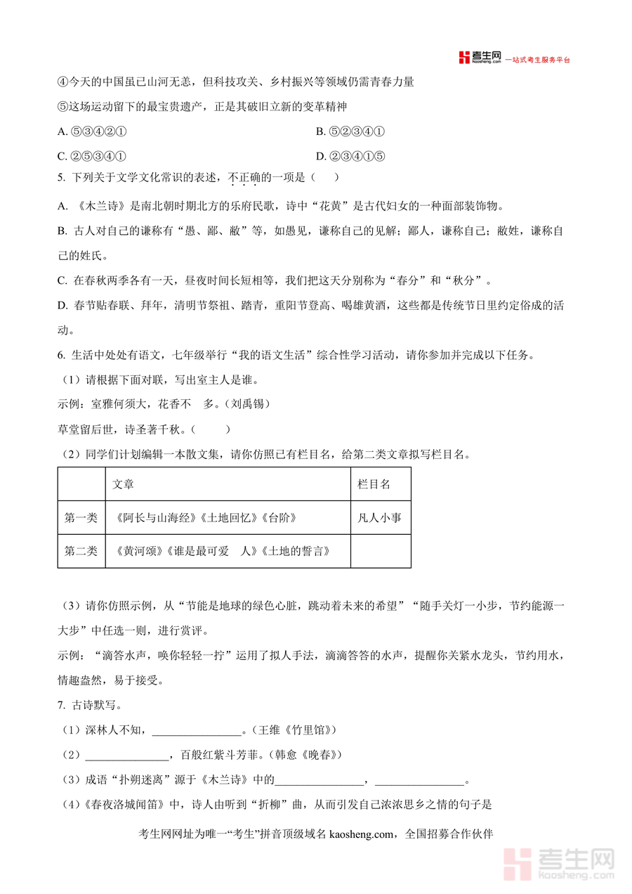 《精品解析:湖南省长沙市明德教育集团2024-2025学年七年级下学期期中语文试题(原卷版).docx》是一份聚焦七年级下学期期中语文核心考点的权威真题资料,核心内容涵盖积累运用(含字音字形纠错、成语辨析、病句修改、古诗文默写等)与阅读与理解(含古诗鉴赏、文言文阅读、非连续性文本阅读及文学类文本阅读)两大板块,特色亮点在于依托明德教育集团专业命题团队资源,题目严格遵循义务教育语文课程标准七年级下册要求,精准呈现期中阶段高频考点与题型设置,为学生提供原汁原味且具有区域代表性的真题训练素材。
