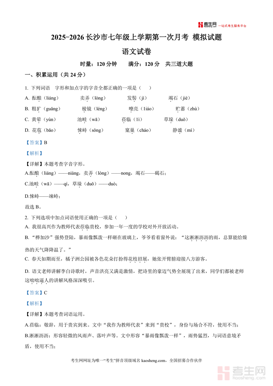 《精品解析:湖南省长沙市2025-2026学年七年级上学期第一次月考语文试题(解析版).docx》是一份针对长沙地区七年级新生入学后首次语文月考的专业化备考资料,聚焦部编版教材七年级上册前半学期核心知识点,涵盖积累运用、阅读与鉴赏、综合性学习等全题型解析。其特色在于每道题均配备详实答案与深度解析,不仅明确正误选项,更针对字音字形易错点、词语运用语境分析、句子排序逻辑及文学文化常识进行拓展补充,帮助学生精准把握考点方向与命题规律,形成系统知识框架